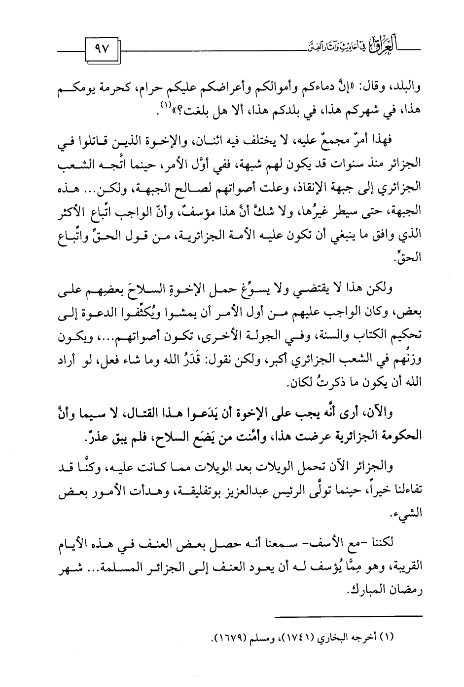 والآن، أرى أنَّه يجب على الإخوة أن يَدَعوا هذا القتال، لا سيما وأنَّ الحكومة الجزائرية عرضت هذا، وأمَّنت من يَضَع السلاح، فلم يبق عذرٌ.
