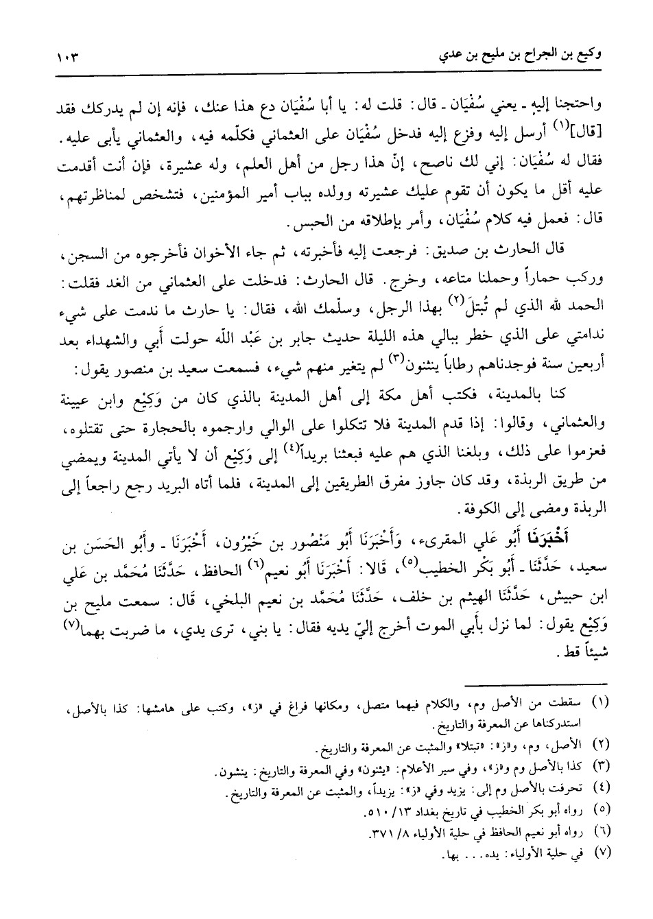 احتجنا إليه يعني سفيان قال قلت له يا أبا سفيان دع هذا عنك فإنه إن لم يدركك فقد قال (1) أرسل إليه وفزع إليه فدخل سفيان على العثماني فكلمه فيه والعثماني يأبى عليه فقال له سفيان إني لك ناصح إن هذا رجل من أهل العلم وله عشيرة فإن أنت أقدمت عليه أقل ما يكون أن تقوم عليك عشيرته وولده بباب أمير المؤمنين فتشخص لمناظرتهم قال فعمل فيه كلام سفيان وأمر بإطلاقه من الحبس قال الحارث بن صديق فرجعت إليه فأخبرته ثم جاء الأخوان فأخرجوه من السجن وركب حمارا وحملنا متاعه وخرج قال الحارث فدخلت على العثماني من الغد فقلت الحمد لله الذي لم تبتل (2) بهذا الرجل وسلمك الله فقال يا حارث ما ندمت على شئ ندامتي على الذي خطر ببالي هذه الليلة حديث جابر بن عبد الله حولت أبي والشهداء بعد أربعين سنة فوجدناهم رطابا ينثنون (3) لم يتغير منهم شئ فسمعت سعيد بن منصور يقول كنا بالمدينة فكتب أهل مكة إلى أهل المدينة بالذي كان من وكيع وابن عيينة والعثماني وقالوا إذا قدم المدينة فلا تتكلوا على الوالي وارجموه بالحجارة حتى تقتلوه فعزموا على ذلك وبلغنا الذي هم عليه فبعثنا بريدا (4) إلى وكيع أن لا يأتي المدينة ويمضي من طريق الربذة وقد كان جاوز مفرق الطر إلى المدينة فلما أتاه البريد رجع راجعا إلى الربذه ومضى إلى الكوفة أخبرنا أبو علي المقرئ وأخبرنا أبو منصور بن خيرون أخبرنا وأبو الحسن بن سعيد حدثنا أبو بكر الخطيب (5) قالا أخبرنا أبو نعيم (6) الحافظ حدثنا محمد بن علي ابن حبيش حدثنا الهيثم بن خلف حدثنا محمد بن نعيم البلخي قال سمعت مليح بن وكيع يقول لما نزل بأبي الموت أخرج إلي يديه فقال يا بني ترى يدي ما ضربت بهما (7) شيئا قط