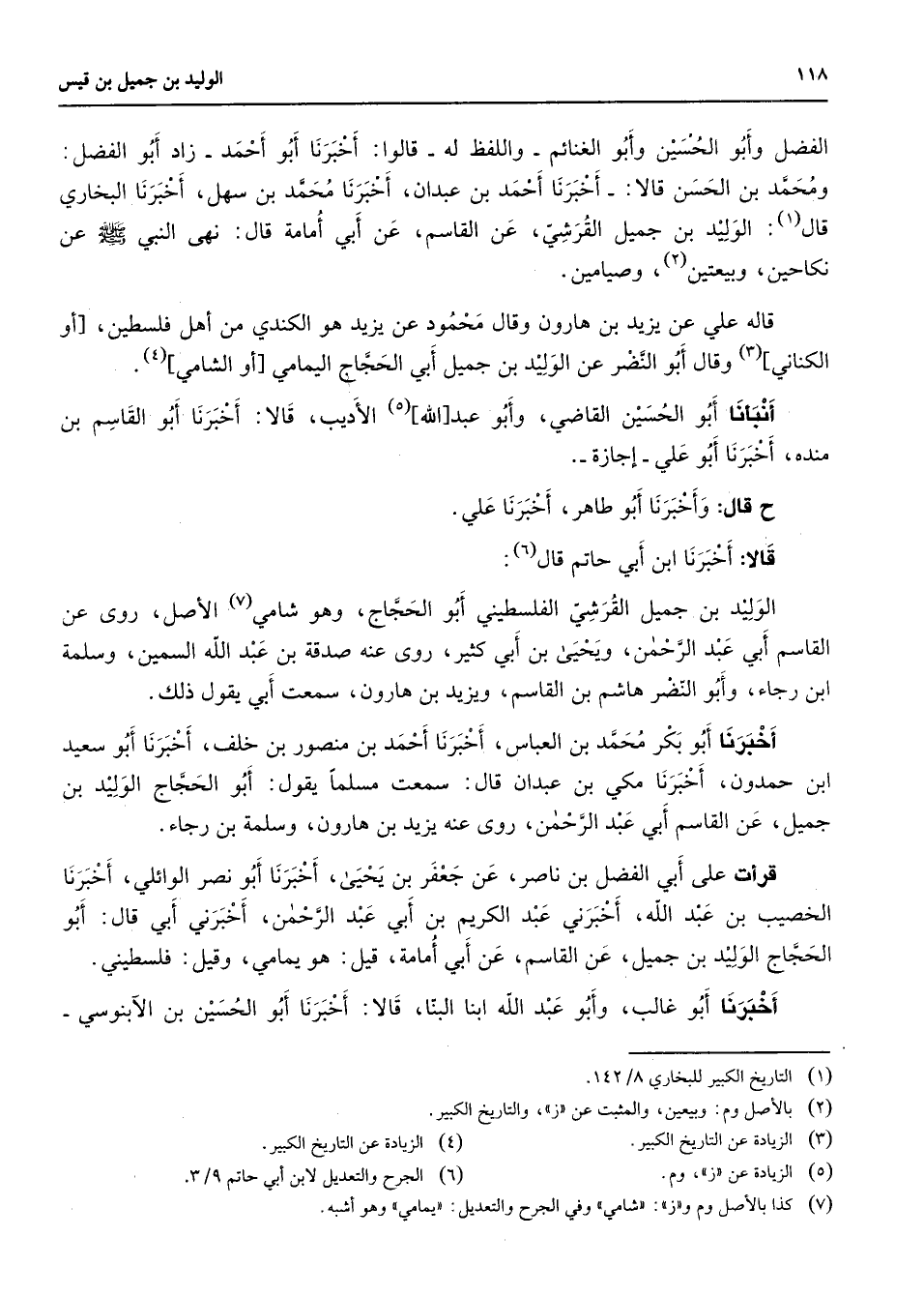 الفضل وأبو الحسين وأبو الغنائم واللفظ له قالوا أخبرنا أبو أحمد زاد أبو الفضل ومحمد بن الحسن قالا أخبرنا أحمد بن عبدان أخبرنا محمد بن سهل أخبرنا البخاري قال (1) الوليد بن جميل القرشي عن القاسم عن أبي أمامة قال نهى النبي (صلى الله عليه وسلم) عن نكاحين وبيعتين (2) وصيامين قاله علي عن يزيد بن هارون وقال محمود عن يزيد هو الكندي من أهل فلسطين أو الكناني (3) وقال أبو النضر عن الوليد بن جميل أبي الحجاج اليمامي أو الشامي (4) أنبأنا أبو الحسين القاضي وأبو عبد الله (5) الأديب قالا أخبرنا أبو القاسم بن منده أخبرنا أبو علي إجازة قال وأخبرنا أبو طاهر أخبرنا علي قالا أخبرنا ابن أبي حاتم قال (6) الوليد بن جميل القرشي الفلسطيني أبو الحجاج وهو شامي (7) الأصل روى عن القاسم أبي عبد الرحمن ويحيى بن أبي كثير روى عنه صدقة بن عبد الله السمين وسلمة ابن رجاء وأبو النضر هاشم بن القاسم ويزيد بن هارون سمعت أبي يقول ذلك أخبرنا أبو بكر محمد بن العباس أخبرنا أحمد بن منصور بن خلف أخبرنا أبو سعيد ابن حمدون أخبرنا مكي أخبرنا مكي بن عبدان قال سمعت مسلما يقول أبو الحجاج الوليد بن جميل عن القاسم أبي عبد الرحمن روى عنه يزيد بن هارون وسلمة بن رجاء قرأت على أبي الفضل بن ناصر عن جعفر بن يحيى أخبرنا أبو نصر الوائلي أخبرنا الخصيب بن عبد الله أخبرني عبد الكريم بن أبي عبد الرحمن أخبرني أبي قال أبو الحجاج الوليد بن جميل عن القاسم عن أبي أمامة قيل هو يمامي وقيل فلسطيني أخبرنا أبو غالب وأبو عبد الله ابنا البنا قالا أخبرنا أبو الحسين بن الآبنوسي