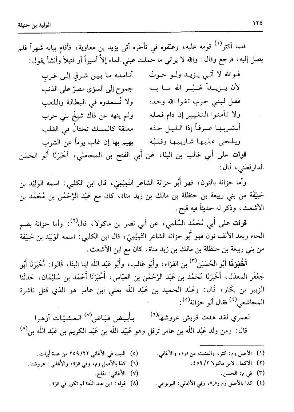 * فلما أكثر (1) قومه عليه وعنفوه في تأخره أتى يزيد بن معاوية فأقام ببابه شهر فلم يصل إليه فرجع وقال والله لا يراني ما حملت عيني الماء إلا أسيرا أو قتيلا وأنشأ يقول * فوالله لا آتي يزيد ولو حوت * أنامله ما بين شرق إلى غرب لأن يزيدا غير الله ما به * جموح إلى السؤي مصر على الذنب فقل لنبي حرب تقوا الله وحده * ولا تسعدوه في البطالة واللعب ولا تأمنوا التغيير إن دام فعله * ولم ينهه عن ذاك شيخ بني حرب أيشربها صرفاإذا الليل جنه * معتقه كالمسك تختال في القلب ويلحى عليها شاربيها وقلبه * يهيم بها إن غاب يوما عن الشرب * قرأت على أبي غالب بن البنا عن أبي الفتح بن المحاملي أخبرنا أبو الحسن الدارقطني قال وأما حزانة بالنون فهو أبو حزانه الشاعر التميمي قال ابن الكلبي اسمه الوليد بن حنيفة من بني ربيعة بن حنظلة بن مالك بن زيد مناة كان مع عبد الرحمن بن محمد بن الأشعت وذكر له حديثا فيه قبح قرأت على أبي محمد السلمي عن أبي نصر بن ماكولا قال (2) وأما حزانة بضم الحاء وبعد الألف نون فهو أبو حزانة الشاعر التميمي قال ابن الكلبي اسمه الوليد بن حنيفة من بني ربيعة بن حنظلة بن مالك بن زيد مناة كان مع ابن الأشعت أخبرنا أبو الحسين (3) بن الفراء وأبو غالب وأبو عبد الله ابن البنا قالوا أخبرنا أبو جعفر المعدل أخبرنا محمد بن عبد الرحمن بن العباس أخبرنا أحمد بن سليمان حدثنا الزبير بن بكار قال وعبد الحميد بن عبد الله يعني ابن عامر هو الذي قتل ناشره المجاشي (4) فقال أبو حزانة (5) * لعمري لقد هدت قريش عروشها (6) * بأبيض فياض (7) العشيات أزهرا * قال ومن ولد عبد الله بن عامر ترفل وهو عبيد الله بن عبد الكريم بن عبد الله بن (8)