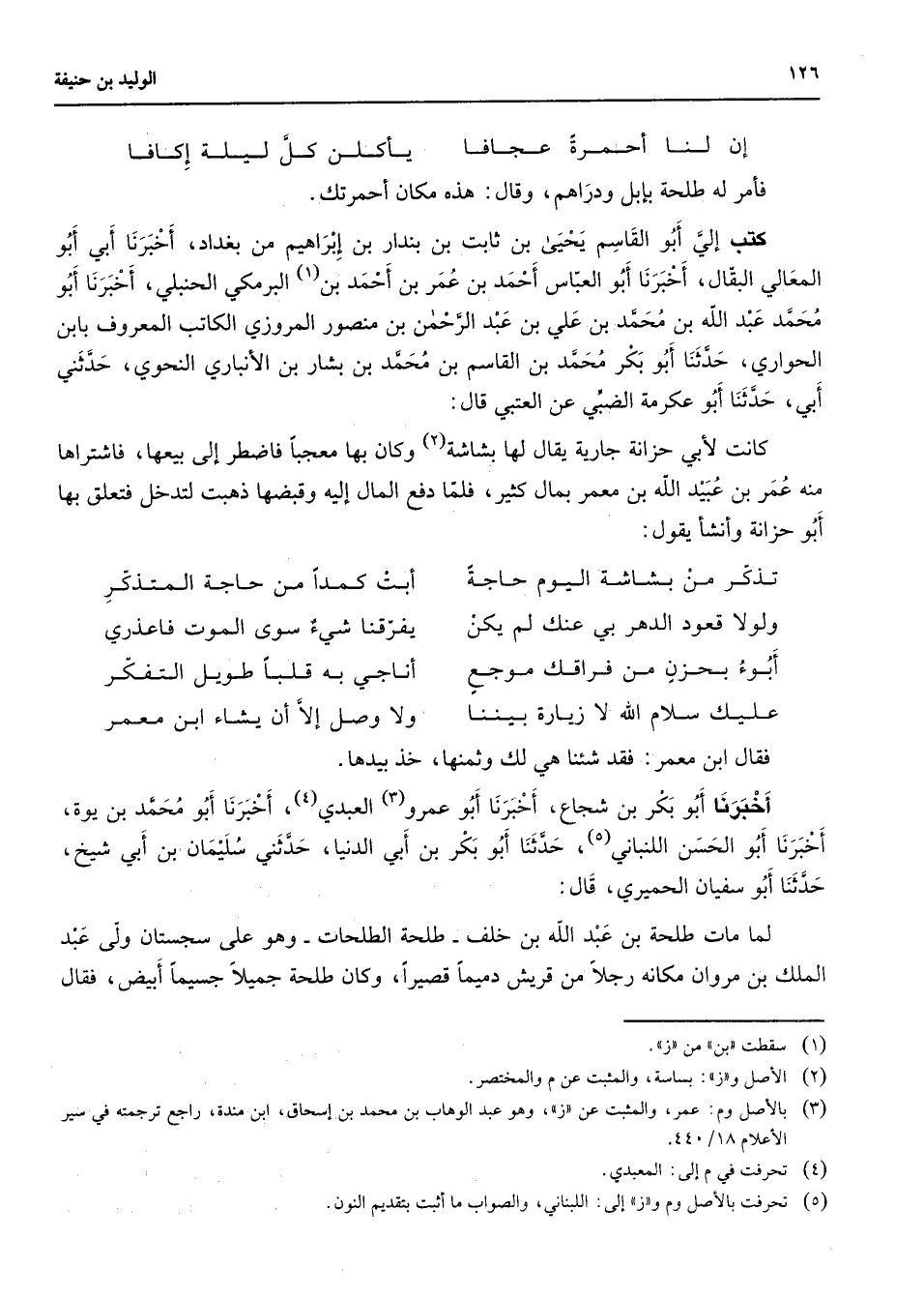 إن لنا أحمرة عجافا * يأكلن كل ليلة إكافا * فأمر له طلحة بإبل ودراهم وقال هذا مكان أحمرتك كتب إلي أبو القاسم يحيى بن ثابت بن بندار بن إبراهيم من بغداد أخبرنا أبي أبو المعالي البقال أخبرنا أبو العباس أحمد بن عمر بن أحمد بن (1) البرمكي الحنبلي أخبرنا أبو محمد عبد الله بن محمد بن علي بن عبد الرحمن بن منصور المروزي الكاتب المعروف بابن الحواري حدثنا أبو بكر محمد بن القاسم بن محمد بن بشار بن الأنباري النحوي حدثني أبي حدثنا أبو عكرمة الضبي عن العتبي قال كانت لأبي حزانة جارية يقال لها بشاشة (2) وكان بها معجبا فاضطر إلى بيعها فاشتراها منه عمر بن عبيد الله بن معمر بمال كثير فلما دفع المال إليه وقبضها ذهبت لتدخل فتعلق بها أبو حزانة وأنشأ يقول * تذكر من بشاشة اليوم حاجة * أبت كمدا من حاجة المتذكر ولولا قعود الدهر بي عنك لم يكن * يفرقنا شئ سوى الموت فاعذري أبوء بحزن من فراقك موجع * أناجي به قلبا طويل التفكر عليك سلام الله لا زيارة بيننا * ولا وصل إلا أن يشاء ابن معمر * فقال ابن معمر فقد شئنا هي لك وثمنها خذ بيدها أحبرنا أبو بكر بن شجاع أخبرنا أبو عمرو (3) العبدي (4) أخبرنا أبو محمد بن يوه أخبرنا أبو الحسن اللنباني (5) حدثنا أبو بكر بن أبي الدنيا حدثني سليمان بن ابي شيخ حدثنا أبو سفيان الحميري قال لما مات طلحة بن عبد الله بن خلف طلحة الطلحات وهو على سجستان ولى عبد الملك بن مروان مكانه رجلا من قريش دميما قصيرا وكان طلحة جميلا جسيما أبيض فقال