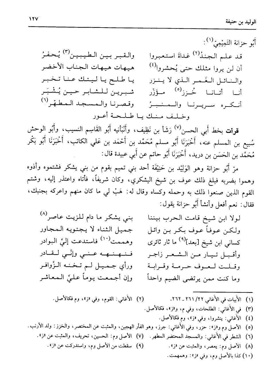 أبو حزانة التميمي (1) قد علم الجند (2) غداة استعبروا * والقبر بين الطيبين (3) يحفر أن لن يروا مثلك حتى يحشروا (4) * هيهات هيهات الجناب الأخضر والنائل الغمر الذي لا ينزر * يا طلح يا ليتك عنا تخبر أنا أتانا خزز (5) مؤزر * شبرين للشابر حين يبشر أنكره سريرنا والمنبر * وقصرنا والمسجد المطهر (6) وخلف منك يا طلحة أعور قرأت بخط أبي الحسن (7) رشأ بن نظيف وانبانيه أبو القاسم النسيب وأبو الوحش سبيع بن المسلم عنه أخبرنا أبو مسلم محمد بن أحمد بن علي الكاتب أخبرنا أبو بكر محمد بن الحسن بن دريد أخبرنا أبو حاتم عن أبي عبيدة قال مر أبو حزانة وهو الوليد بن حنيفة أحد بني تميم بقوم من بني يشكر فشتموه وأذوه وهموا بضربه فبلغ ذلك عوف بن شيخ اليشكري وكان شريفا فأتاه واعتذر إليه وشتم القوم الذين صنعوا ذلك به وحمله وكساه وقال له هب لي ما كان منهم وأعركه بجنبك فقال نعم أفعل وأنشأ أبو حزانة يقول * لولا ابن شيخ قامت الحرب بيننا * بني يشكر ما دام للزيت عاصر (8) ولكن عوفا عوف بكر بن وائل * جميل الثناء لا يجتويه المجاور كساني ابن شيخ بعد (9) ما ثار ثائري * وهممت (10) فاستدعت إلي البوادر واقبل تيار من الشعر زاجر * فنهنه عني وإني لقادر وقلت لعوف حرمة وقرابة * ورأي جميل لم تخنه الزوافر وما كنت ممن يرتضى الضيم واحدا * وإن أجمعت يوما علي المعاشر