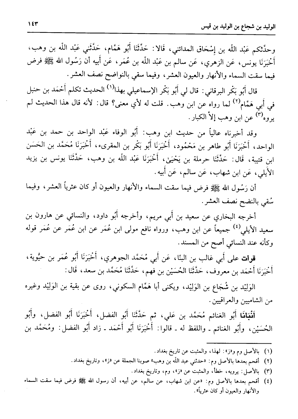 وحدثكم عبد الله بن إسحاق المدائني قالا حدثنا أبو همام حدثني عبد الله بن وهب أخبرنا يونس عن الزهري عن سالم بن عبد الله بن عمر عن أبيه أن رسول الله (صلى الله عليه وسلم) فرض فيما سقت السماء والأنهار والعيون العشر وفيما سقي بالنواضج نصف العشر قال أبو بكر البرقاني قال لي أبو بكر الإسماعلي بهذا (1) الحديث تكلم أحمد بن حنبل في أبي همام (2) لما رواه عن ابن وهب قلت لأي معنى قال لأنه قال هذا الحديث لم يروه (3) عن ابن وهب إلا الكبار وقد أخبرناه عاليا من حديث ابن وهب أبو الوفاء عبد الواحد بن حمد بن عبد الواحد أخبرنا أبو طاهر بن محمود أخبرنا أبو بكر بن المقرئ أخبرنا محمد بن الحسن ابن قتيبة قال حدثنا حرملة بن يحيى أخبرنا عبد الله بن وهب حدثنا يونس بن يزيد الأيلي عن ابن شهاب عن سالم عن أبيه أن رسول الله (صلى الله عليه وسلم) فرض فيما سقت السماء والأنهار والعيون أو كان عتريا العشر وفيما سقي بالنضج نصف العشر أخرجه البخاري عن سعيد بن أبي مريم وأخرجه أبو داود والنسائي عن هاورن بن سعيد الأيلي (4) جميعا عن ابن وهب ورواه نافع مولى ابن عمر عن ابن عمر عن عمر قوله وكأنه عند النسائي أصج من المسند قرأت على أبي غالب بن البنا عن أبي محمد الجوهري أخبرنا أبو عمر بن حيوية أخبرنا أحمد بن معروف حدثنا الحسين بن فهم حدثنا محمد بن سعد قال الوليد بن شجاع بن الوليد ويكنى أبا همام السكوني روى عن بقية بن الوليد وغيره من الشاميين والعراقيين أنبأنا أبو الغنائم محمد بن علي ثم حدثنا أبو الفضل أخبرنا أبو الفضل وأبو الحسين وأبو الغنائم واللفظ له قالوا أخبرنا أبو أحمد زاد أبو الفضل ومحمد بن