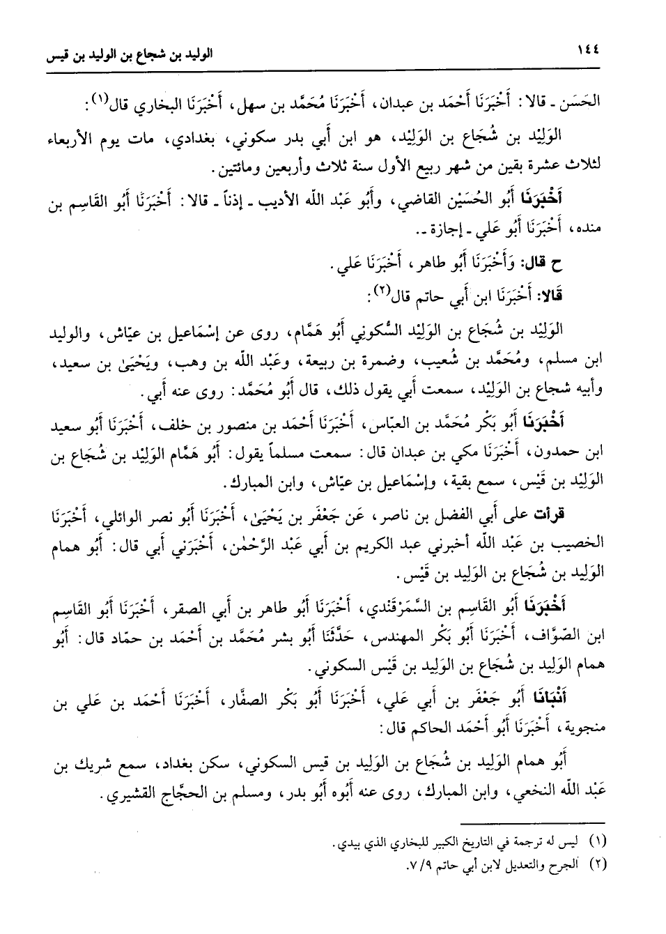 الحسن قالا أخبرنا أحمد بن عبدان أخبرنا محمد بن سهل أخبرنا البخاري قال (1) الوليد بن شجاع بن الوليد هو ابن أبي بدر سكوني بغدادي مات يوم الإربعاء لثلاثة عشرة بقين من شهر ربيع الأول سنة ثلاث وأربعين ومائتين أخبرنا أبو الحسين القاضي وأبو عبد الله الأديب إذنا قالا أخبرنا أبو القاسم بن منده أخبرنا أبو علي إجازة قال وأخبرنا أبو طاهر أخبرنا علي قالا أخبرنا ابن أبي حاتم قال (2) الوليد بن شحاع بن الوليد السكوني أبو همام روى عن إسماعيل بن عياش والوليد ابن مسلم ومحمد بن شعيب وضمرة بن ربيعة وعبد الله بن وهب ويحيى بن سعيد وأبيه شجاع بن الوليد سمعت أبي يقول ذلك قال أبو محمد روى عنه أبي أخبرنا أبو بكر محمد بن العباس أخبرنا أحمد بن منصور بن خلف أخبرنا أبو سعيد ابن حمدون أخبرنا مكي بن عبدان قال سمعت مسلما يقول أبو همام الوليد بن شجاع بن الوليد بن قيس سمع بقية وإسماعيل بن عياش وابن المبارك قرأت على أبي الفضل بن ناصر عن جعفر بن يحيى أخبرنا أبو نصر الوائلي أخبرنا الخصيب بن عبد الله أخبرني عبد الكريم بن أبي عبد الرحمن أخبرني أبي قال أبو همام الوليد بن شجاع بن الوليد بن قيس أخبرنا أبو القاسم بن السمرقندي أخبرنا أبو طاهر بن أبي الصقر أخبرنا أبو القاسم ابن الصواف أخبرنا أبو بكر المهندس حدثنا أبو بشر محمد بن أحمد بن حماد قال أبو همام الوليد بن شحاع بن الوليد بن قيس السكوني أنبأنا أبو جعفر بن أبي علي أخبرنا أبو بكر الصفار أخبرنا أحمد بن علي بن منجويه أخبرنا أبو أحمد الحاكم قال أبو همام الوليد بن شجاع بن الوليد بن قيس السكوني سكن بغداد سمع شريك بن عبد الله النخعي وابن المبارك روى عنه أبوه أبو بدر ومسلم بن الحجاج القشيري