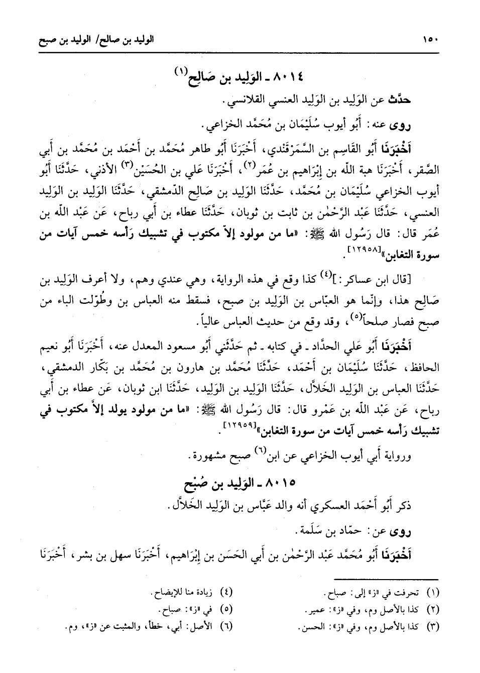 8014 - الوليد بن صالح (1) حدث عن الوليد بن الوليد العنسي القلانسي روى عنه أبو أيوب سليمان بن محمد الخزاعي أخبرنا أبو القاسم بن السمرقندي أخبرنا أبو طاهر محمد بن أحمد بن محمد بن أبي الصقر أخبرنا هبة الله بن إبراهيم بن عمر (2) أخبرنا علي بن الحسين (3) الأذني حدثنا أبو أيوب الخزاعي سليمان بن محمد حدثنا الوليد بن صالح الدمشقي حدثنا الوليد بن الوليد العنسي حدثنا عبد الرحمن بن ثابت بن ثوبان حدثنا عطاء بن أبي رباح عن عبد الله بن عمر قال قال رسول الله (صلى الله عليه وسلم) ما من مولود إلا مكتوب في تشبيك رأسه خمس آيات من سورة التغابن قال ابن عساكر (4) كذا وقع في هذه الرواية وهي عندي وهم ولا أعرف الوليد بن صالح وإنما هو العباس بن الوليد بن صبح فسقط منه العباس بن وطولت الباء من صبح فصار صلحا (5) وقد وقع من حديث العباس عاليا أخبرنا أبو علي الحداد في كتابة ثم حدثني أبو مسعود المعدل عنه اخبرنا أبو نعيم الحافظ حدثنا سليمان بن أحمد حدثنا محمد بن هارون بن محمد بن بكار الدمشقي حدثنا العباس بن الوليد الخلال حدثنا الوليد بن الوليد حدثنا ابن ثوبان عن عطاء بن أبي رباح عن عبد الله بن عمرو قال قال رسول الله (صلى الله عليه وسلم) ما من مولود يولد إلا مكتوب في تشبيك رأسه خمس آيات من سورة التغابن ورواية أبي أيوب الخزاعي عن إبن (6) صبح مشهورة 8015 الوليد بن صبح ذكر أبو أحمد العسكري أنه والد عباس بن الوليد الخلال روى عن حماد بن سلمة أخبرنا أبو محمد عبد الرحمن بن أبي الحسن بن إبراهيم أخبرنا سهل بن بشر أخبرنا