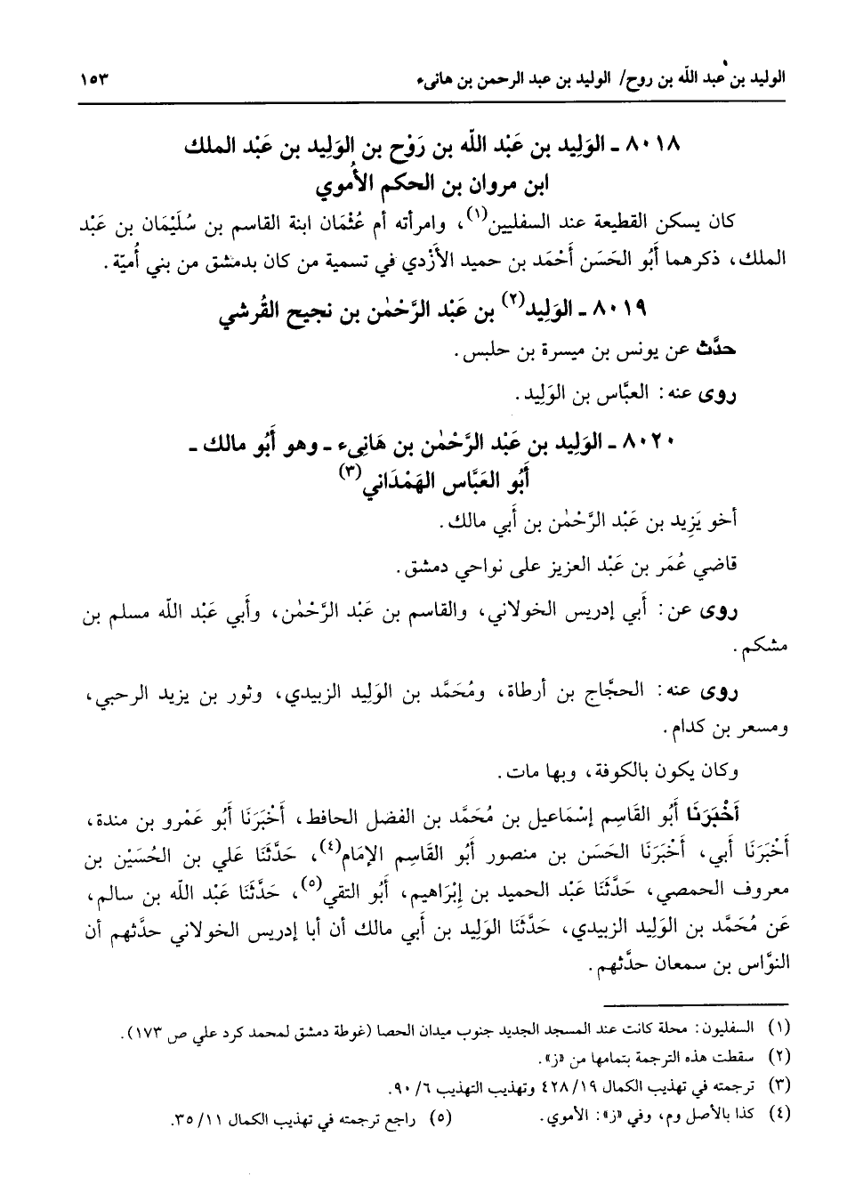 8018 - الوليد بن عبد الله بن روح بن الوليد بن عبد الملك ابن مروان بن الحكم الأموي كان يسكن القطيعة عند السفليين (1) وامرأته أم عثمان ابنة القاسم بن سليمان بن عبد الملك ذكرهما أبو الحسن أحمد بن حميد الأزدي في تسمية من كان بدمشق من بني أمية