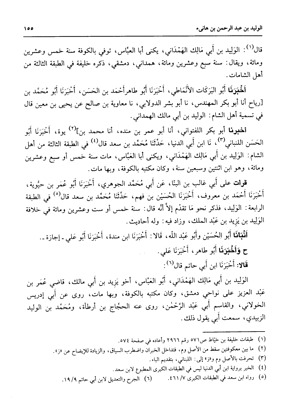 قال (1) الوليد بن أبي مالك الهمداني يكنى أبا العباس توفي بالكوفة سنة خمس وعشرين ومائة ويقال سنة سبع وعشرين ومائة همداني دمشقي ذكره خليفة في الطبقة الثالة من أهل الشامات أخبرنا أبو البركات الأنماطي أخبرنا أبو طاهر أحمد بن الحسن أخبرنا أبو محمد بن رياح أنا أبو بكر المهندس نا أبو بشر الدولابي نا معاوية بن صالح عن يحيى بن معين قال في تسمية أهل الشام الوليد بن أبي مالك الهمداني أخبرنا أبو بكر اللفتواني أنا أبو عمر بن منده أنا محمد بن (2) يوة أخبرنا أبو الحسن اللنباني (3) نا ابن أبي الدنيا حدثنا محمد بن سعد قال (4) في الطبقة الثالثة من أهل الشام الوليد بن أبي مالك الهمداني ويكنى أبا العباس مات سنة خمس أو سبع وعشرين ومائة وهو ابن اثنتين وسبعين سنة وكان مكتبة با لكوفة وبها مات قرأت على أبي غالب بن البنا عن أبي محمد الجوهري أخبرنا أبو عمر بن حيوية أخبرنا أحمد بن معروف أخبرنا الحسين بن فهم حدثنا محمد بن سعد قال (5) في الطبقة الرابعة الوليد فذكر نحو ما تقدم إلا أنه قال سنة خمس أو ست وعشرين ومائة في خلافة الوليد بن يزيد بن عبد الملك وزاد فيه وله أحاديث أبنأنا أبو الحسين وأبو عبد الله قالا أخبرنا ابن منده أخبرنا أبو علي إجازة واخبرنا أبو طاهر أخبرنا علي قالا أخبرنا ابن أبي حاتم قال (6) الوليد بن أبي مالك الهمداني أبو العباس أخو يزيد بن أبي مالك قاضي عمر بن عبد العزيز على نواحي دمشق وكان مكتبة بالكوفة وبها مات روى عن أبي إدريس الخولاني والقاسم أبي عبد الرحمن روى عنه الحجاج بن أرطأة ومحمد بن الوليد الزبيدي سمعت أبي يقول ذلك