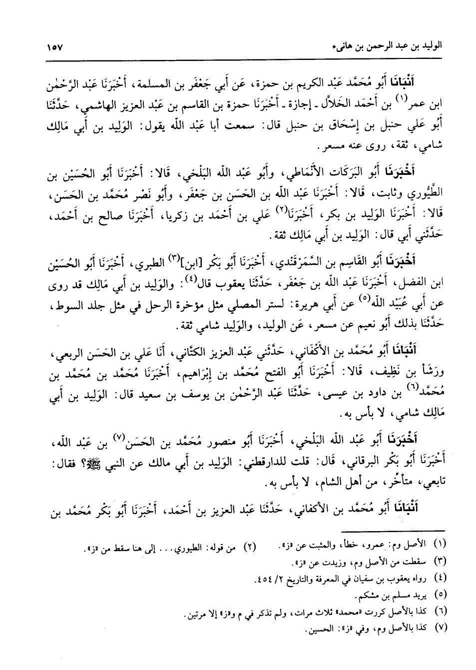 أنبأنا أبو محمد عبد الكريم بن حمزة عن أبي جعفر بن المسلمة أخبرنا عبد الرحمن ابن عمر (1) بن أحمد الخلال إجازة أخبرنا حمزة بن القاسم بن عبد العزيز الهاشمي حدثنا أبو علي حنبل بن إسحاق بن حنبل قال سمعت أبا عبد الله يقول الوليد بن أبي مالك شامي ثقة روى عنه مسعر أخبرنا أبو البركات الأنماطي وأبو عبد الله البلخي قالا أخبرنا أبو الحسين بن الطيوري وثابت قالا أخبرنا عبد الله بن الحسن بن جعفر وأبو نصر محمد بن الحسن قالا أخبنا الوليد بن بكر أخبرنا (2) علي بن أحمد بن زكريا أخبرنا صالح بن أحمد حدثني أبي قال الوليد بن أبي مالك ثقة أخبرنا أبو القاسم بن السمرقندي أخبرنا أبو بكر ابن (3) الطبري أخبرنا أبو الحسين ابن الفضل أخبرنا عبد الله بن جعفر حدثنا يعقوب قال (4) والوليد بن ابي مالك قد روى عن أبي عبيد الله (5) عن أبي هريرة لستر المصلي مثل مؤخرة الرحل في مثل جلد السوط حدثنا بذلك أبو نعيم عن مسعر عن الوليد والوليد شامي ثقة أنبأنا أبو محمد بن الأكفاني حدثني عبد العزيز الكتاني أنا علي بن الحسن الربعي ورشا بن نظيف قالا أخبرنا أبو الفتح محمد بن إبراهيم أخبرنا محمد بن محمد بن محمد (6) بن داود بن عيسى حدثنا عبد الرحمن بن يوسف بن سعيد قال الوليد بن أبي مالك شامي لا بأس به أخبرنا أبو عبد الله البلخي أخبرنا أبو منصور محمد بن الحسن (7) بن عبد الله أخبرنا أبو بكر البرقاني قال قلت للدارقطني الوليد بن أبي مالك عن النبي (صلى الله عليه وسلم) فقال تابعي متأخر من أهل الشام لا بأس به أنبأنا أبو محمد بن الأكفاني حدثنا عبد العزيز بن أحمد أخبرنا أبو بكر محمد بن