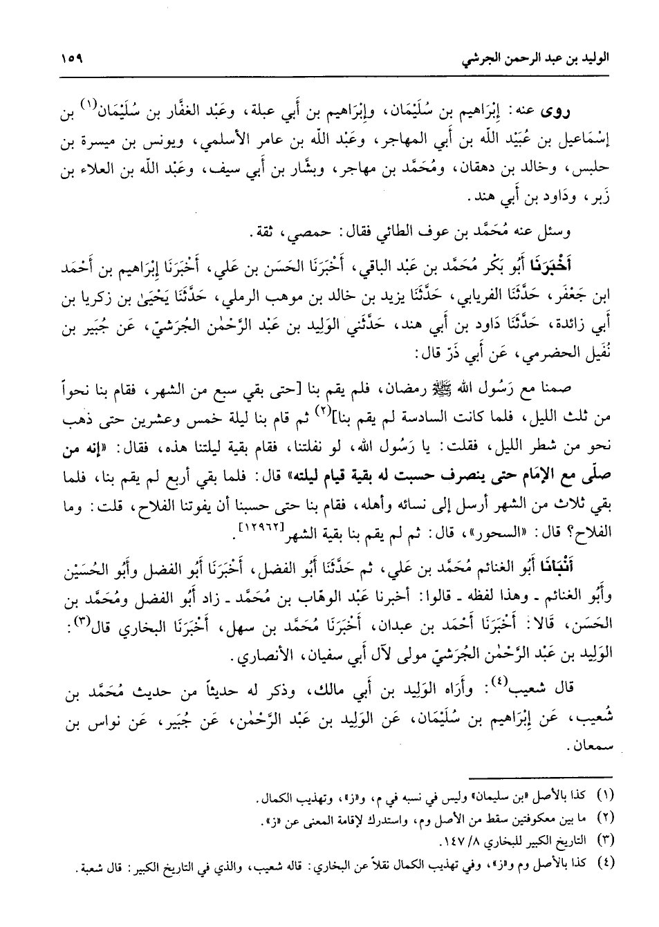 روى عنه إبراهيم بن سليمان وإبراهيم بن أبي عبلة وعبد الغفار بن سليمان (1) بن إسماعيل بن عبيد الله بن أبي المهاجر وعبد الله بن عامر الأسلمي ويونس بن ميسرة بن حلبس وخالد بن دهقان ومحمد بن مهاجر وبشار بن أبي سيف ة عبد الله بن العلاء بن زبر وداود بن أبي هند وسئل عنه محمد بن عوف الطائي فقال حمصي ثقة أخبرنا أبو بكر محمد بن عبد الباقي أخبرنا الحسن بن علي أخبرنا إبراهيم بن أحمد ابن جعفر حدثنا الفريابي حدثنا يزيد بن خالد بن موهب الرملي حدثنا يحيى بن زكريا بن أبي زائدة حدثنا داود بن أبي هند حدثني الوليد بن عبد الرحمن الجرشي عن جبير بن نفيل الحضرمي عن أبي ذر قال صمنا مع رسول الله (صلى الله عليه وسلم) رمضان فلم يقم بنا حتى بقي سبع من الشهر فقام بنا نحوا من ثلث الليل فلما كانت السادسة لم يقم بنا (2) ثم قام بنا ليلة خمس وعشرين حتى ذهب نحو من شطر الليل فقلت يا رسول الله لو نفلتنا فقام بقية ليلتنا هذه فقال إنه من صلى مع الإمام حتى ينصرف حسبت له بقية قيام ليلته قال فلما بقي أربع لم يقم بنا فلما بقي ثلاث من الشهر أرسل إلى نسائه وأهله فقام بنا حتى حسبنا أن يفوتنا الفلاح قلت وما الفلاح قال السحور قال ثم لم يقم بنا بقية الشهر أنبأنا أبو الغنائم محمد بن علي ثم حدثنا أبو الفضل أخبرنا أبو الفضل وأبو الحسين وابو الغنائم وهذا لفظه قالوا أخبرنا عبد الوهاب بن محمد زاد أبو الفضل ومحمد بن الحسن قالا أخبرنا أحمد بن عبدان أحبرنا محمد بن سهل أخبرنا البخاري قال (3) الوليد بن عبد الرحمن الجرشي مولى لآل أبي سفيان الأنصاري قال شعيب (4) وأراه الوليد بن أبي مالك وذكر له حديثا من حديث محمد بن شعيب عن إبراهيم بن سليمان عن الوليد بن عبد الرحمن عن جبير عن نواس بن سمعان
