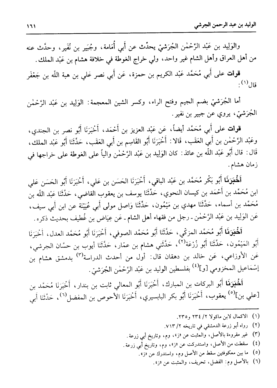 والوليد بن عبد الرحمن الجرشي يحدث عن أبي أمامة وجبير بن نفير وحدث عنه من أهل العراق وأهل الشام غير واحد ولي خراج الغوطة في خلافة هشام بن عبد الملك قرأت على أبي محمد عبد الكريم بن حمزة عن أبي نصر علي بن هبة الله بن جعفر قال (1) أما الجرشي بضم الجيم وفتح الراء وكسر الشين المعجمة الوليد بن عبد الرحمن الجرشي يروي عن جبير بن نفير قرأت على أبي محمد أيضا عن عبد العزيز بن أحمد أخبرنا أبو نصر بن الجندي وعبد الرحمن بن أبي العقب قالا أخبرنا أبو القاسم بن أبي العقب حدثنا أبو عبد الملك قال قال أبو عبد الله بن عائذ كان الوليد بن عبد الرحمن واليا على الغوطة على خراجها في زمان هشام أخبرنا أبو بكر محمد بن عبد الباقي أخبرنا الحسن بن علي أخبرنا أبو الحسن علي ابن محمد بن أحمد بن كيسان النحوي حدثنا يوسف بن يعقوب القاضي حدثنا عبد الله بن محمد بن أسماء حدثنا مهدي بن ميمون حدثنا واصل حولي أبي عيينة بن ابن أبي سيف عن الوليد بن عبد الرحمن رجل من فقهاء أهل الشام عن عياض بن غطيف بحديث ذكره أخبرنا أبو محمد المزكي حدثنا أبو محمد الصوفي أخبرنا أبو محمد العدل أخبرنا أبو الميمون حدثنا أبو زرعة (2) حدثني هشام بن عمار حدثنا أيوب بن حسان الجرشي عن الأوزاغي عن خالد بن دهقان قال أول من أحدث الدراسة (3) بدمشق هشام بن إسماعيل المخزومي و (4) بفلسطين الوليد بن عبد الرحمن الجرشي أخبرنا أبو البركات بن المبارك أخبرنا أبو المعالي ثابت بن بندار أخبرنا محمد بن علي بن (5) يعقوب أخبرنا أبو بكر البابسيري أخبرنا الأحوص بن المفضل (6) حدثنا أبي