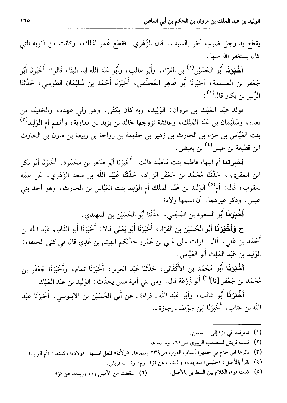 أن يقطع يد رجل ضرب آخر بالسيف قال الزهري فقطع عمر لذلك وكانت من ذنوبه التي كان يستغفر الله منها أخبرنا أبو الحسين (1) بن الفراء وابو غالب وأبو عبد الله ابنا البنا قالوا أخبرنا أبو جعفر بن المسلمة أخبرنا أبو طاهر المخلص أخبرنا أحمد بن سليمان الطوسي حدثنا الزبير بن البكار قال (2) فولد عبد الملك بن مروان الوليد به وكان يكنى وهو ولي عهده والخليفة من بعده وسليمان بن عبد الملك وعائشة تزوجها خالد بن يزيد بن معاوية وأمهم أم الوليد (3) بنت العباس بن جزء بن الحارث بن زهير بن جذيمة بن رواحة بن ربيعة بن مازن بن الحارث ابن قطيعة بن عبس (4) بن بغيض أخبرتنا أم البهاء فاطمة بنت محمد قالت أخبرنا أبو طاهر بن محمود أخبرنا أبو بكر ابن المقرئ حدثنا محمد بن جعفر الزراد حدثنا عبيد الله بن سعد الزهري عن عمه يعقوب قال أم (5) الوليد بن عبد الملك أم الوليد بنت العباس بن الحارث وهو أحد بني عبس وذكر غيرهما أن اسمها ولادة أخبرنا أبو السعود بن المجلي حدثنا أبو الحسين بن المهتدي وأخبرنا أبو الحسين بن الفراء أخبرنا أبو يعلى قالا أخبرنا أبو القاسم عبد الله بن أحمد بن علي قال قرأت على علي بن عمرو حدثكم الهيثم بن عدي قال في كنى الخلفاء الوليد بن عبد الملك أبو العباس أخبرنا أبو محمد بن الأكفاني حدثنا عبد العزيز أخبرنا تمام وأخبرنا جعفر بن محمد بن جعفر نا (6) أبو زرعة قال ومن بني أمية ممن يحدث الوليد بن عبد الملك أخبرنا أبو غالب وأبو عبد الله قراءة عن أبي الحسين بن الآبنوسي أخبرنا عبد الله بن عتاب أخبرنا أبو جوصا إجازة