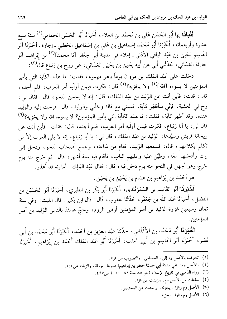 أنبأنا بها أبو الحسن علي بن محمد بن العلاء أخبرنا أبو الحسن الحمامي (1) سنة سبع عشرة وأربعمائة أخبرنا أبو محمد إسماعيل بن علي بن إسماعيل الخطبي إجازة أخبرنا أبو القاسم يحيى بن عبد الباقي الأذني إملاء في مدينة أبي جعفر نا محمد (2) بن إبراهيم أبو حارثة الغساني حدثني أبي عن أبيه يحيى بن يحيى الغساني عن روح بن زنباغ قال (3) دخلت على عبد الملك بن مروان يوما وهو مهموم فقلت ما هذه الكآبة التي بأمير المؤمنين لا يسوءه الله (4) ولا يخزيه (5) قال فكرت فيمن أوليه أمر العرب فلم أجده قال قلت وأين أنت عن الوليد بن عبد الملك قال إنه لا يحسن النحو قال فقال لي رح لي العشية فإني سأظهر كآبة فسلني مع ذاك وخلني والوليد قال فرحت إليه والوليد عنده وقد أظهر كآبة فقلت ما هذه الكآبة التي بأمير المؤمنين لا يسوءه الله ولا يخزيه (6) قال لي يا أبا زنباع فكرت فيمن أوليه أمر العرب فلم أجده قال فقلت فأين أنت عن ريحانة قريش وسيدها الوليد بن عبد الملك قال لي يا أبا زنباع إنه لا يلي العرب إلا من تكلم بكلامهم قال فسمعها الوليد فقام من ساعته وجمع أصحاب النحو ودخل إلى بيت وأدخلهم معه وطين عليه وعليهم الباب فأقام فيه ستة أشهر قال ثم خرج منه يوم خرج وهو أجهل في النحو منه يوم دخل فيه قال فقال عبد الملك أما إنه قد أعذر هو أحمد بن إبراهيم بن هشام بن يحيى بن يحيى أخبرنا أبو القاسم بن السمرقندي أخبرنا أبو بكر بن الطبري أخبرنا أبو الحسين بن الفضل أخبرنا عبد الله بن جعفر حدثنا يعقوب قال قال ابن بكير قال الليث وفي سنة ثمان وسبعين غزوة الوليد بن أمير المؤمنين أرض الروم وحج عامئذ بالناس الزليد بن أمير المؤمنين أخبرنا أبو محمد بن الأكفاني حدثنا عبد العزيز بن أحمد أخبرنا أبو محمد بن أبي نصر أخبرنا أبو القاسم بن أبي العقب أخبرنا أبو عبد الملك أحمد بن إبراهيم أخبرنا