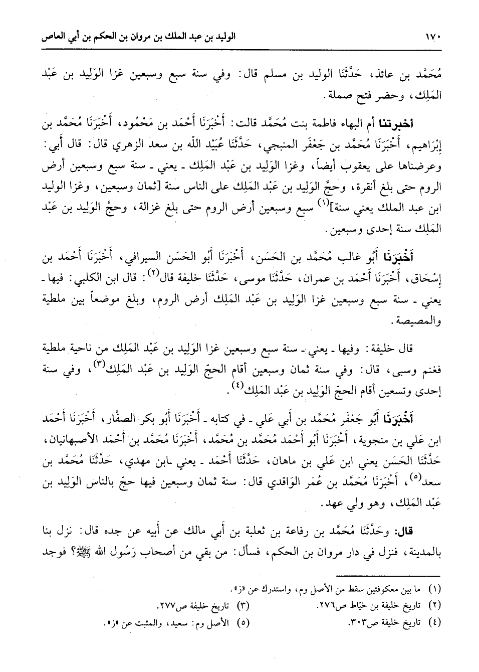 محمد بن عائذ حدثنا الوليد بن مسلم قال وفي سنة سبع وسبعين غزا الوليد بن عبد الملك وحضر فتح صملة أخبرتنا أم البهاء فاطمة بنت محمد قالت أخبرنا أحمد بن محمود أخبرنا محمد بن إبراهيم أخبرنا محمد بن جعفر المنبجي حدثنا عبيد الله بن سعد الزهري قال قال أبي وعرضناها على يعقوب أيضا وغزا الوليد بن عبد الملك يعني سنة سبع وسبعين أرض الروم حتى بلغ أنقرة وحج الوليد بن عبد الملك على الناس سنة ثمان وسبعين وغزا الوليد ابن عبد الملك يعني سنة (1) سبع وسبعين أرض الروم حتى بلغ غزالة وحج الوليد بن عبد الملك سنة إحدى وسبعين أخبرنا أبو غالب محمد بن الحسن أخبرنا أبو الحسن السيرافي أخبرنا أحمد بن إسحاق أخبرنا أحمد بن عمران حدثنا موسى حدثنا خليفة قال (2) قال ابن الكلبي فيها يعني سنة سبع وسبعين غزا الوليد بن عبد الملك أرض الروم وبلغ موضعا بين ملطية والمصيصة قال خليفة وفيها يعني سنة سبع وسبعين غزا الوليد بن عبد الملك من ناحية ملطية فغنم وسبى قال وفي سنة ثمان وسبعين أقام الحج الوليد بن عبد الملك (3) وفي سنة إحدى وتسعين أقام الحج الوليد بن عبد الملك (4) أخبرنا أبو جعفر محمد بن أبي علي في كتابه أخبرنا أبو بكر الصفار أخبرنا أحمد ابن علي بن منجويه أخبرنا أبو أحمد محمد بن محمد أخبرنا محمد بن أحمد الأصبهانبان حدثنا الحسن يعني ابن علي بن ماهان حدثنا أحمد يعني ابن مهدي حدثنا محمد بن سعد (5) أخبرنا محمد بن عمر الواقدي قال سنة ثمان وسبعين فيها حج بالناس الوليد بن عبد الملك وهو ولي عهد قال وحدثنا محمد بن رفاعة بن ثعلبة بن أبي مالك عن أبيه عن جده قال نزل بنا بالمدينة فنزل في دار مروان بن الحكم فسأل من بقي من أصحاب رسول الله (صلى الله عليه وسلم) فوجد