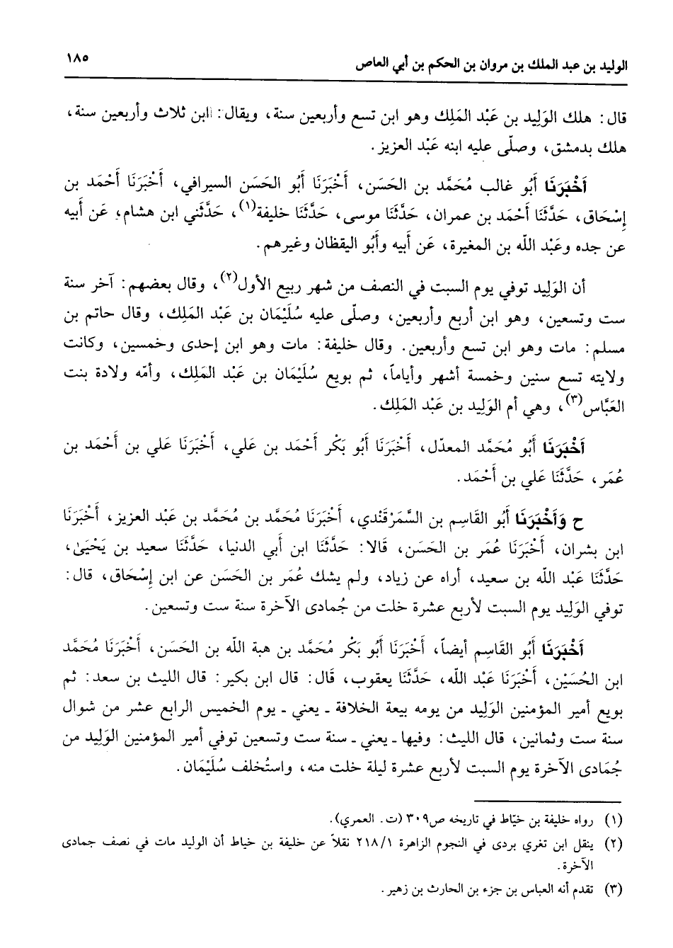 (2) ينقل ابن تغري بردي في النجوم الزاهرة 1 / 218 نقلا عن خليفة بن خياط أن الوليد مات في نصف جمادى الآخرة