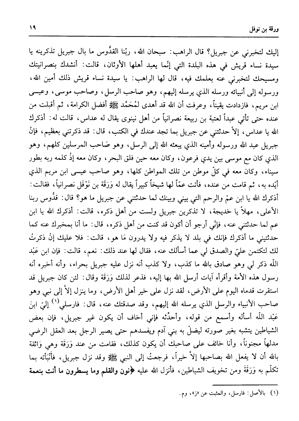إليك لتخبرني عن جبريل قال الراهب سبحان الله ربنا القدوس ما بال جبريل تذكرينه يا سيدة نساء قريش في هذة البلدة التي إنما يعبد أهلها الأوثان قالت أنشدك بنصرانيتك ومسيحك لتخبرني عنه بعلمك فيه قال لها الراهب يا سيدة نساء قريش ذلك أمين الله ورسوله إلى أنبيائه ورسله الذي يرسله إليهم وهو صاحب الرسل وصاحب موسى وعيسى ابن مريم فازدادت يقينا وعرفت أن الله قد أهدى لمحمد (صلى الله عليه وسلم) أفضل الكرامة ثم أقبلت من عنده حتى تأتي عبدا لعتبة بن ربيعة نصرانيا من أهل نينوي يقال له عداس قالت له أذكرك الله يا عداس إلا حدثتني عن جبريل بما تجد عندك في الكتب قال قد ذكرتني بعظيم فإن جبريل عبد الله ورسوله وأمينه الذي يبعثه الله إلى الرسل وهو صاحب المرسلين كلهم وهو الذي كان مع موسى بين يدي فرعون وكان معه حين فلق البحر وكان معه إذا كلمه ربه بطور سيناء وكان معه في كل موطن من تلك المواطن كلها وهو صاحب عيسى ابن مريم الذي أيده به ثم قامت من عنده فأتت عما لها شيخا كبيرا يقال له ورقة بن نوفل نصرانيا فقالت أذكرك الله يا ابن عم والرحم التي بيني وبينك لما جدثتني عن جبريل ما هو قال قدوس ربنا الأعلى مهلا يا خديجة لا تذكرين جبريل ولست من أهل ذكره قالت أذكرك الله يا ابن عم لما حدثتني عنه فإني أرجو أن أكون قد كنت من أهل ذكره قال ما أنا بمخبرك عنه كما حدثتني ما أذكرك فإنك في بلد لا يذكر فيه ولا يدرون ما هو قالت فلا عليك أن ذكرت لك لتكتمن علي والصدق لي عما أسألك عنه فقال لها عند ذلك نعم قالت فإن ابن عبد الله ذكر لي وهو صادق بالله ما كذب ولا كذب إنه نزل عليه جبريل بحراء وإنه أخبره أنه رسول هذه الأمه وأقرأه آيات أرسل الله بها إليه فذعر لذلك ورقة وقال لئن كان حبريل قد استقرت قدماه اليوم على الأرض لقد نزل على خير أهل الأرض وما ينزل إلا إلى نبي وهو صاحب الأنبياء والرسل الذي يرسله الله إليهم وقد صدقتك عنه قال فأرسلي (1) إلي ابن عبد الله أسأله وأسمع من قوله وأحدثه فإني أخاف أن يكون غير جبريل فإن بعض الشياطين يتشبه بغير صورته ليظل به بني آدم ويفسدهم حتى يصير الرجل بعد العقل الرضي مدلها مجنونا وأنا خائف على صاحبك أن يكون كذلك فقامت من عند ورقة وهي واثقة بالله أن لا يفعل الله بصاحبها إلا خيرا فرجعت إلى النبي (صلى الله عليه وسلم) وقد نزل جبريل فأنبأته بما تكلم به ورقة ومن تخويف الشياطين فأنزل الله عليه " نون والقلم وما يسطرون ما أنت بنعمة