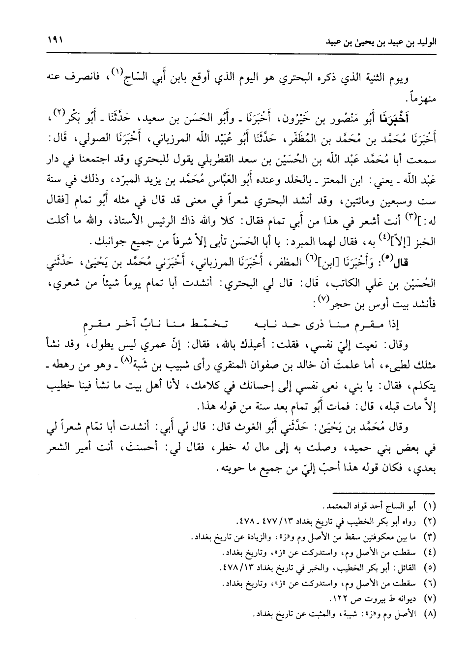 ويوم الثنية الذي ذكره البحتري هو اليوم الذي أوقع بابن أبي الساج (1) فانصرف عنه منهزما أخبرنا أبو منصور بن خيرون أخبرنا وأبو الحسن بن سعيد حدثنا أبو بكر (2) أخبرنا محمد بن محمد بن الظفر حدثنا أبو عبيد الله المرزباني أخبرنا الصولي قال سمعت أبا محمد عبد الله بن الحسين بن سعد القطربلي يقول للبحتري وقد اجتمعنا في دار عبد الله يعني ابن المعتز بالخلد وعنده أبو العباس محمد بن يزيد المبرد وذلك في سنة ست وسبعين ومائتين وقد أنشد البحتري شعرا في معنى قد قال في مثله أبو تمام فقال له (3) أنت أشعر في هذا من أبي تمام فقال كلا والله ذاك الرئيس الأستاذ والله ما أكلت الخبز إلا (4) به فقال لهما المبرد: يا أبا الحسن تأبى إلا شرفا من جميع جوانبك