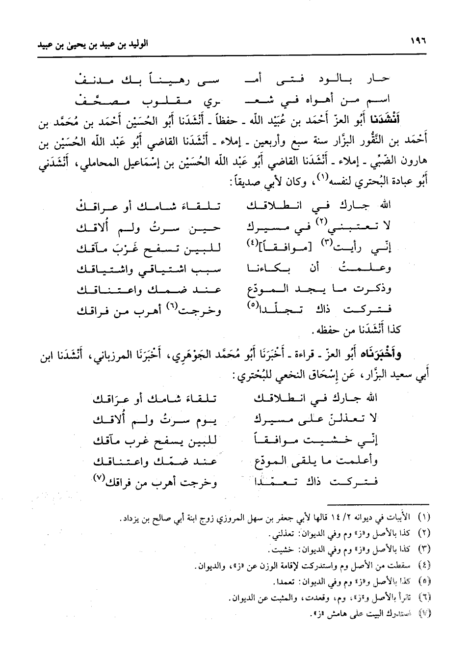 حار بالود فتى أم * سى رهينا بك مدنف إسم من أهواه في شع * ري مقلوب مصحف * أنشدنا أبو العز أحمد بن عبيد الله - حفظا - أنشدنا أبو الحسين أحمد بن محمد بن أحمد بن النقور البزار سنة سبع وأربعين - إملاء - أنشدنا القاضي أبو عبد الله الحسين بن هارون الضبي - إملاء - أنشدنا القاضي أبو عبد الله الحسين بن إسماعيل المحاملي أنشدني أبو عبادة البحتري لنفسه (1) وكان لأبي صديقا * الله جارك في انطلاقك * تلقاء شامك أو عراقك لا تعتبني (2) في مسيرك * حين سرت ولم ألقدمك إني رأيت (3) موافقا (4) * للبين تسفح غرب مآقك وعلمت أن بكاءنا * سبب اشتياقي واشتياقك * * وذكرت ما يجد المودع * عند ضمك واعتناقك فتركت ذاك تجلدا (5) وخرجت (6) أهرب من فراقك * كذا أنشدا من حفظه وأخبرنا أبو العز قراءة أخبرنا أبو محمد الجوهري أخبرنا المرزباني أنشدنا ابن أبي سعيد البزاز عن إسحاق النخعي للبحتري * الله جارك في انطلاقك * تلقاء شامك أو عراقك لا تعذلن عللا مسيرك * يوم سرت ولم ألاقك إني خشيت موافقه * للبين يفسح غرب مآقك وأعلمت ما يلقى المودع * عند ضمك واعتناقك فتركت ذلك تعمدا * وخرجت أهرب من فراقك (7)