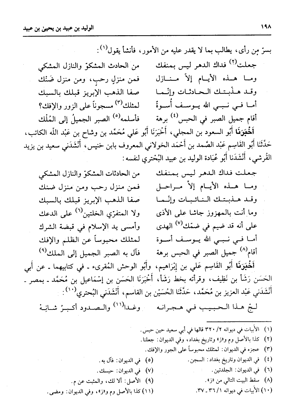 بسر من رأى يطالب بما لا يقدر عليه من الأمور فأنشأ يقول (1) * جعلت (2) فداك الدهر ليس بمنفك * من الحادث المشكو والنازل المشكي وما هذه الأيام منازل * فمن منزل رحب ومن منزل ضنك * وقد هذبتك الحادثات وإنما * صفا الذهب الإبريز قبلك بالسبك * أما في نبي الله يوسف أسوة * لمثلك (3) مسجونا على الزور والإفك * أقام جميل الصبر في الحبس (4) برهة * فأسلمه (5) الصبر الجميل إلى الملك * أخبرنا أبو السعود بن المجلي أخبرنا أبو علي محمد بن وشاح بن عبد الله الكاتب حدثنا أبو القاسم عيد الصمد بن أحمد الخولاني المعروف بابن خنيس أنشدني سعيد بن يزيد القرشي أنشدنا أبو عبادة الوليد بن عبيد البحتري لنفسه * جعلت فداك الدهر ليس بمنفك * من الحادثات المشكو والنازل المشكي وما هذه الأيام إلا مراحل * فمن منزل رحب ومن منزل ضنك وقد هذبتك النائبات وإنما * صفا الذهب الإبريز قبلك بالسبك وما أنت بالمهزوز جاشا على الأذى * ولا المفتري الخلتين (6) على الدعك * على أنه قد ضيم في ضمك الهدى * وأمسى يد الإسلام في قبضة الشرك أما في نبي الله يوسف أسوة * لمثلك محبوسا عن الظلم والإفك أقام (8) جميل الصبر في الحبس برهة * فآل به الصبر الجميل إلى الملك (9) أخبرنا أبو القاسم علي بن إبراهيم وأبو الوحش المقرئ في كتابيهما عن أبي الحسن رشأبن نظيف وقرأته بخط رشأ أخبرنا الحسن بن إسماعيل بن محمد بمصر أنشدي عبد العزيز بن محمد حدثنا الحسين بن القاسم أنشدني البحتري (10) لج هذا الحبيب في هجرانه * وغدا (11) والصدود أكبر شانه