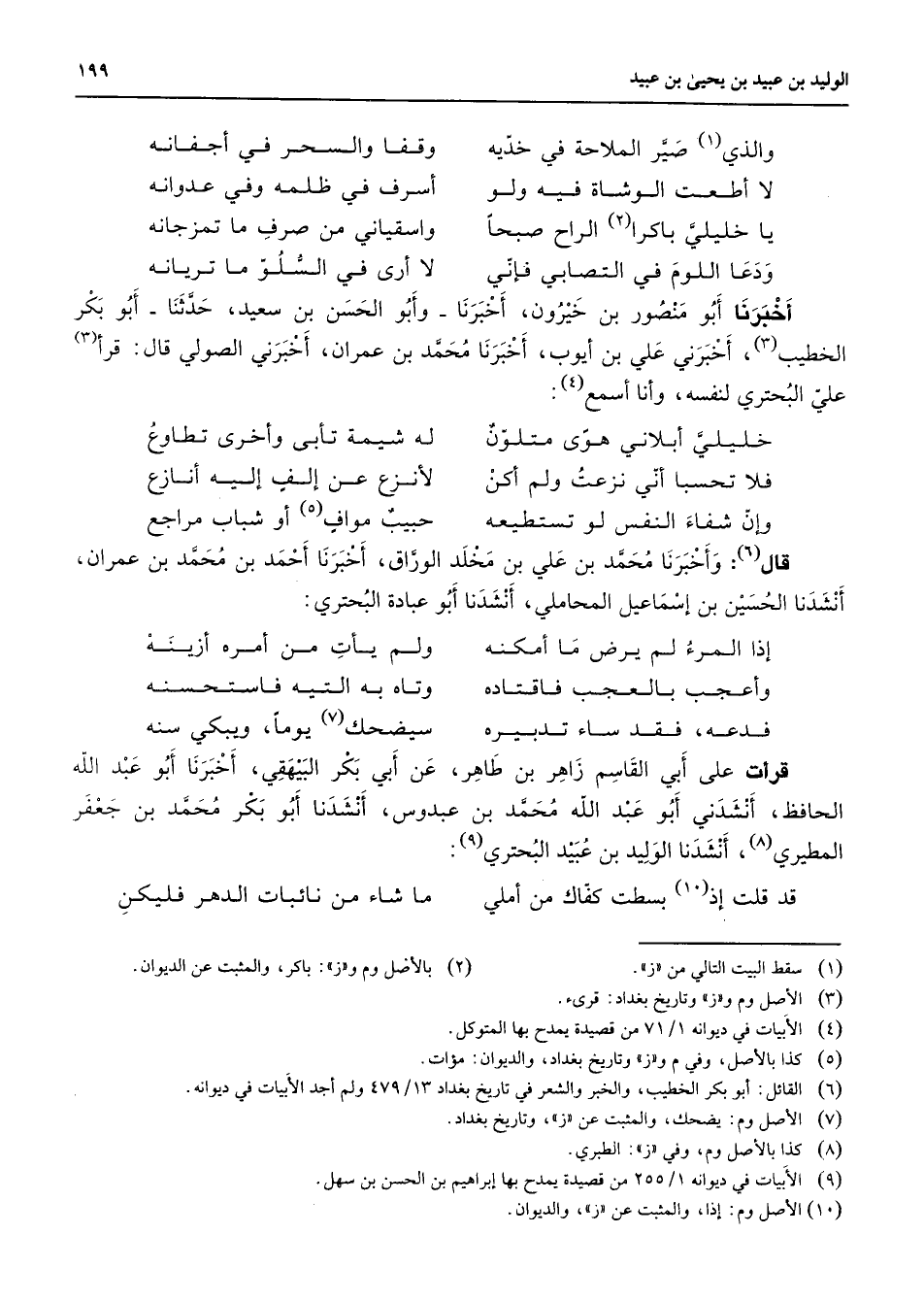 والذي (1) صير الملاحة في خديه * وقفا والسحر في أجفانه لا أطعت الوشاة فيه ولو * أسرف في ظلمه وفي عدوانه يا خليلي باكرا (2) الراح صبحا * وأسقياني من صرف ما تمزجانه ودعا اللوم في التصابي فإني * لا أرى في السلو ما تريانه * أخبرنا أبو منصور بن خيرون أخبرنا وأبو الحسن بن سعيد حدثنا أبو بكر الخطيب (3) أخبرني علي بن أيوب أخبرنا محمد بن عمران أخبرني الصولي قال قرأ (3) علي البحتري لنفسه وأنا أسمع (4) خليلي أبلاني هوى متلون * له شيمة تأبى وأخرى تطاوع فلا تحسبا أني نزعت ولم أكن * لأنزع إلف إليه أنازع وإن شفاء النفس لو تستطيعه * حبيب مواف (5) أو شباب مراجع * قال (6) واخبرنا محمد بن علي بن مخلد الوراق أخبرنا أحمد بن محمد بن عمران أنشدنا الحسين بن إسماعيل المحاملي أنشدنا أبو عبادة البحتري إذا المرء لم يرض ما أمكنه * ولم يأت من أمره أزينه وأعجب بالعجب فاقتاده * وتاه به التيه فاستحسنه فدعه فقد ساء تدبيره * سيضحك (7) يوما وبيكي سنة * قرأت على أبي القاسم زاهر بن طاهر عن أبي بكر البيهقي أخبرنا أبو عبد الله الحافظ أنشدني أبو عبد الله محمد بن عبدوس أنشدنا أبو بكر محمد بن جعفر المطيري (8) أنشدنا الوليد بن عبيد البحتري (9) قد قلت إذ (10) بسطت كفاك من أملي * ما شاء من نائات الدهر فليكن