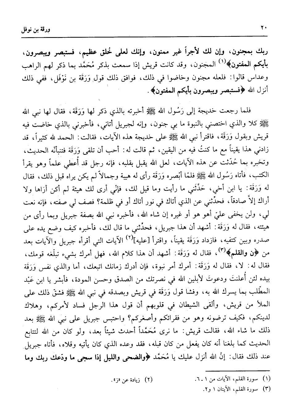ربك بمجنون وإن لك لأجرا غير ممنون وإنك لعلى خلق عظيم فستبصر ويبصرون بأيكم المفتون " (1) المجنون وقد كانت قريش إذا سمعت بذكر محمد بما ذكر لهم الراهب وعداس قالوا فلعله مجنون وخاضوا في ذلك فوافق ذلك قول ورقة بن نوفل ففي ذلك أنزل الله " فستبصر ويبصرون بأيكم المفتون " فلما رجعت خديجة إلى رسول الله (صلى الله عليه وسلم) أخبرتة بالذي ذكر لها ورقة وقال لها نبي الله (صلى الله عليه وسلم) كلا والذي اختصني بالنبوة ما بي جنون وإنه لجبريل أتاني فأخبرني بالذي خاضت فيه قريش وبقول ورقة فاقترأ نبي الله (صلى الله عليه وسلم) على خديجة هذة الآيات فقالت الحمد لله كثيرا قد زادني هذا يقينا مع ما كنت فيه من اليقين ثم قالت له أحب أن تلقى ورقة فتنبأنه الحديث وتخبره بما حدثت عن هذه الآيات لعل الله يقبل بقلبه فإنه رجل قد أعطي علما وهو يقرأ الكتب فأتاه رسول الله (صلى الله عليه وسلم) فلما أبصره ورقة رأى له هيبة وجمالا لم يكن يراه قبل ذلك فقال