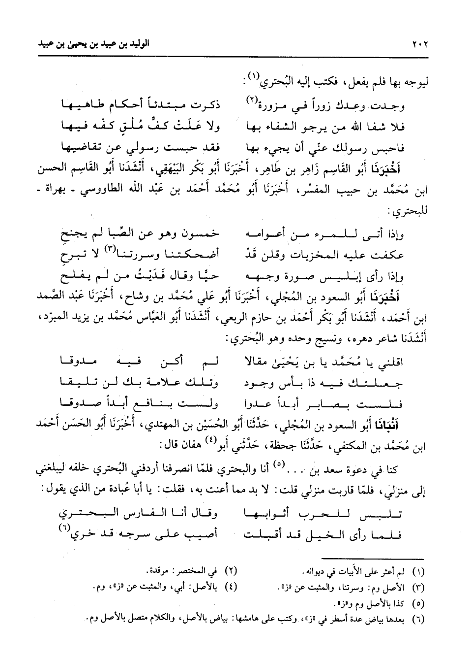 ليوجه بها فلم يفعل فكتب إليه البحتري (1) وجدت وعدك زورا في مزورة (2) ذكرت مبتدئا أحكام طاهيها فلا شفا الله من يرجو الشفاء بها * ولا علت كف ملق كفه فيها فاحبس رسولك عني أن يجئ بها * فقد حبست رسولي عن يقاضيها * أخبرنا أبو القاسم زاهر بن طاهر أخبرنا أبو بكر البيهقي أنشدنا أبو القاسم الحسن ابن محمد بن حبيب المفسر أخبرنا أبو محمد أحمد بن عبد الله الطاووسي بهراة للبحتري * وإذا أتى للمرء من أعوامه * خمسون وهو عن الصبا لم يجنح عكفت عليه المخزيات وقلن قد * أضحكتنا وسررتنا (3) لا تبرح وإذا رأى إبليس صورة وجهه * حيا وقال فديت من لم يفلح * أخبرنا أبو السعود بن المجلي أخبرنا أبو علي محمد بن وشاح أخبرنا عبد الصمد أحمد أتشدنا أبو بكر أحمد بن حازم الربعي أنشدنا أبو العباس محمد بن يزيد المبرد أنشدنا شاعر دهره ونسيج وحده وهو البحتري اقلني يا محمد يا بن يحيى مقالا * لم أكن فيه مدوقا جعلتك فيه ذا بأس وجود * وتلك علامة بك لن تليقا فلست بصابر أبدا عدوا * ولست بنافع أبدا صدوقا * انبأنا أبو السعود المجلي حدثنا أبو الحسين بن المهتدي أخبرنا أبو الحسن أحمد ابن محمد المكتفي حدثنا جحظة حدثني أبو (4) حفان قال كنا في دعوة سعد بن (5) أنا والبحتري فلما انصرفنا أردفني البحتري خلفه ليبلغني إلى منزلي فلما قاربت منزلي قلت لابد مما أعنت به فقلت يا أبا عبادة من الذي يقول * تلبس للحرب أثوابها * وقال أنا الفارس البحتري فلما رأى الخيل قد أقبلت * أصيب على سرجه قد خري (6)
