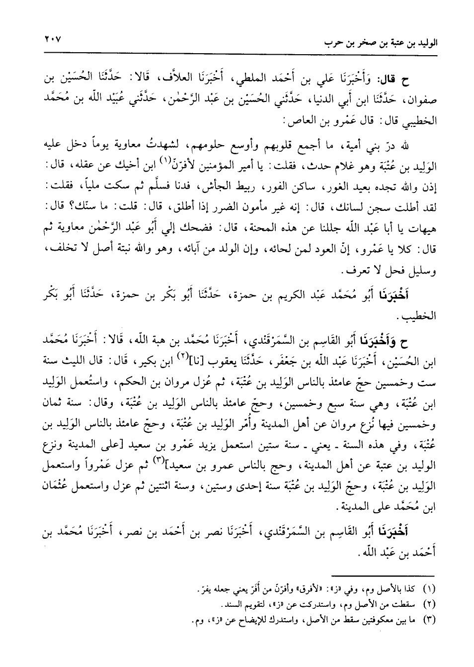 قال واخبرنا علي بن أحمد الملطي أخبرنا العلاف قالا حدثنا الحسين بن صفوان حدثنا ابن أبي الدنيا حدثني الحسين بن عبد الرحمن حدثني عبيد الله بن محمد الخطيبي قال قال عمرو بن العاص الله در بني أمية ما أجمع قلوبهم وأوسع حلومهم لشهدت معاوية يوما دخل عليه الوليد بن عتبة وهو غلام حدث فقلت يا أمير المؤمنين لأفرن (1) ابن أخيك عنعقله قال إذن والله تجده بعيد الغور ساكن الفور ربيط الجأش فدنا فسلم ثم سكت مليا فقلت لقد أطلت سجن لسانك قال إنه غير مأمون الضرر إذا أطلق قال قلت ما سنك قال هيهات يا أبا عبد الله جللنا عن هذه المحنة قال فضحك إلي أبو عبد الرحمن معاوية ثم قال كلا يا عمرو إن العود لمن لحائه وإن الولد من آبائه وهو والله بنتة أصل لا تخلف وسليل فحل لا تعرف أخبرنا أبو محمد عبد الكريم بن حمزة حدثنا أبو بكر بن حمزة حدثنا أبو بكر الخطيب ح وأخبرنا أبو القاسم بن السمرقندي أخبرنا محمد بن هبة الله قالا أخبرنا محمد ابن الحسين أخبرنا عبد الله بن جعفر حدثنا يعقوب نا (2) ابن بكير قال قال الليث سنة ست وخمسين حج عامئذ بالناس الوليد بن عتبة ثم عزل مروان بن الحكم واستعمل الوليد ابن عتبة وهي سنة سبع وخمسين وحج عامئذ بالناس الوليد بن عتبة وقال سنة ثمان وخمسين فيها نزع مروان عن أهل المدينة وأمر الوليد بن عتبة وحج عامئذ بالناس الوليد بن عتبة وفي هذه السنة يعني سنة ستين استعمل يزيد عمرو بن سعيد على المدينة ونزع الوليد بن عتبة وفي هذه السنة - يعني - سنة ستين استعمل يزيد عمرو بن سعيد على المدينة ونزع الوليد بن عتبة عن أهل المدينة وحج بالناس عمرو بن سعيد (3) ثم عزل عمرو واستعمل الوليد بن عتبة وحج الوليد بن عتبة سنة إحدى وستين وسنة اثنتين ثم عزل واستعمل عثمان ابن محمد على المدينة أخبرنا أبو القاسم بن السمرقندي أخبرنا نصر بن أحمد بن نصر أخبرنا محمد بن أحمد بن عبد الله