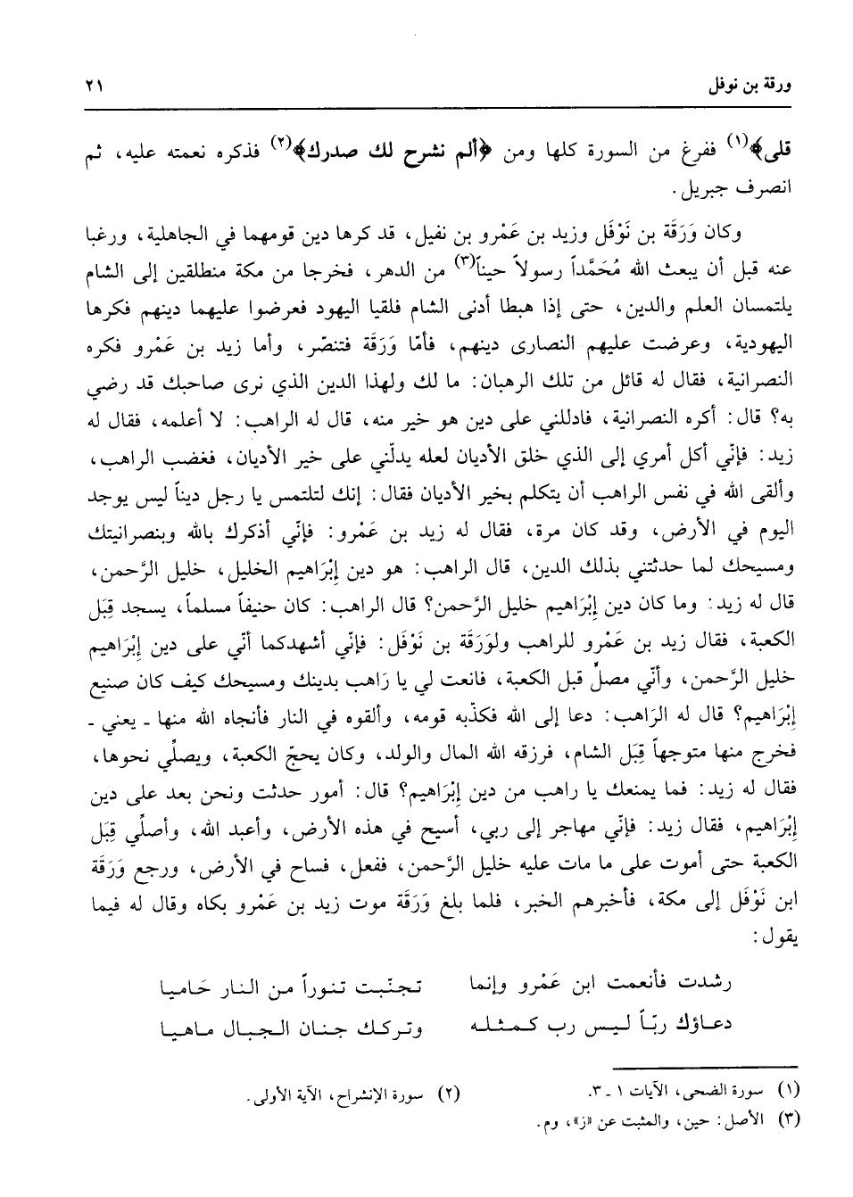 قلى (1) ففرغ من السورة كلها ومن " ألم نشرح لك صدرك " (2) فذكره نعمته عليه ثم إنصرف جبريل وكان ورقة بن نوفل وزيد بن عمرو بن نفيل قدكرها دين قومهما في الجاهلية ورغبا عنه قبل أن يبعث الله محمد رسولا حينا (3) من الدهر فخرجا من مكة منطلقين إلى الشام يلتمسان العلم والدين حتى إذا هبطا أدنى الشام فلقيا اليهود فعرضوا عليهما دينهم فكرها اليهودية وعرضت عليهم النصارى دينهم فأما ورقة فتنصر وأما زيد بن عمرو فكره النصرانية فقال له قائل من تلك الرهبان ما لك ولهذا الدين الذي نرى صاحبك قد رضي به قال أكره النصرانية فادللني على دين هو خير منه قال له الراهب لا أعلمه فقال له زيد فإني أكل أمري إلى الذي خلق الأديان لعله يدلني على خير الأديان فغضب الراهب وألقى الله في نفس الراهب أن يتكلم بخير الأديان فقال إنك لتلتمس يا رجل دينا ليس يوجد اليوم في الأرض وقد كان مره فقال له زيد بن عمرو فإني أذكرك بالله وبنصرانيتك ومسيحك لما حدثتني بذلك الدين قال الراهب هو دين إبراهيم الخليل خليل الرحمن قال له زيد وما كان دين إبراهيم خليل الرحمن قال الراهب كان حنيفا مسلما يسجد قبل الكعبة فقال زيد بن عمرو للراهب ولورقة بن نوفل فإني أشهدكما أني على دين إبراهيم خليل الرحمن وإني مصل قبل الكعبة فانعت لي يا راهب بدينك ومسيحك كيف كان صنيع إبراهيم قال له الراهب دعا إلى الله فكذبه قومه وألقوه في النار فأنجاه الله منها يعني فخرج منها متوجها قبل الشام فرزقه الله المال والولد وكان يحج الكعبة ويصلى نحوها فقال له زيد فما يمنعك يا راهب من دين إبراهيم قال أمور حدثت ونحن بعد على دين إبراهيم فقال زيد فإني مهاجر إلى ربي أسيح في هذه الأرض وأعبد الله وأصلي قبل الكعبة حتى أموت على ما مات عليه خليل الرحمن ففعل فساح في الأرض ورجع ورقة ابن نوفل إلى مكة فأخبرهم الخبر فلما بلغ ورقة موت زيد بن عمرو بكاه وقال له فيما يقول * رشدت فأنعمت ابن عمرو وإنما * تجنبت تنورا من النار حاميا دعاؤك ربا ليس رب كمثله * وتركك جنان الجبال ما هيا