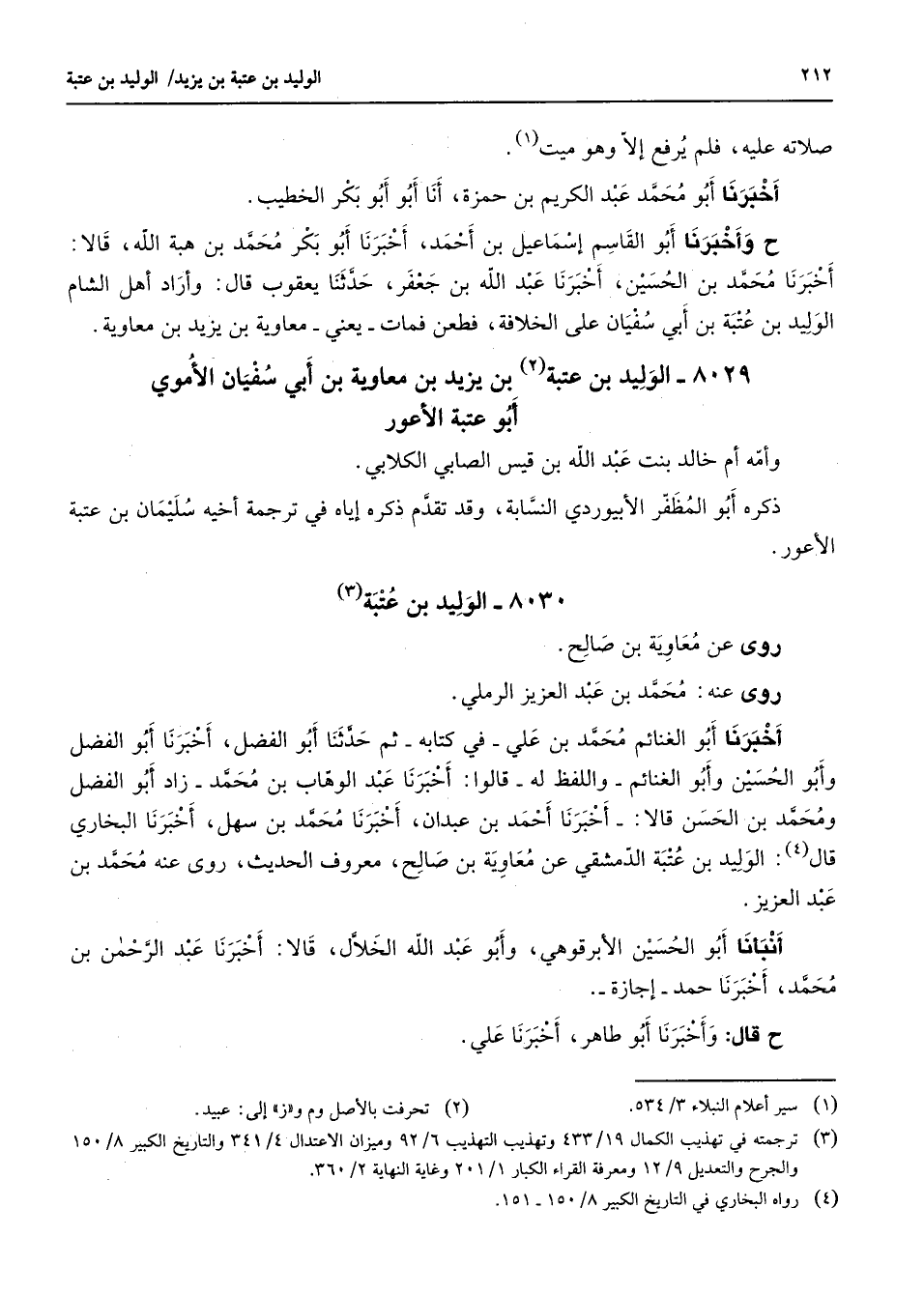 8029 - الوليد بن عتبة (2) بن يزيد بن معاوية بن أبي سفيان الأموي أبو عتبة الأعور وأمه أم خالد بنت عبد الله بن قيس الصابي الكلابي ذكره أبو المظفر الأبيوردي النسابة وقد تقدم ذكره إياه في ترجمة أخيه سليمان بن عتبة الأعور 8030 الوليد بن عتبة (3) روى عن معاوية بن صالح روى عنه محمد بن عبد العزيز الرملي أخبرنا أبو الغنائم محمد بن علي في كتابه ثم حدثنا أبو الفضل أخبرنا أبو الفضل وأبو الحسين وأبو الغنائم واللفظ له قالوا أخبرنا عبد الوهاب بن محمد زاد أبو الفضل ومحمد بن الحسن قالا أخبرنا أحمد بن عبدان أخبرنا محمد بن سهل أخبرنا البخاري قال (4) الوليد بن عتبة الدمشقي عن معاوية بن صالح معروف الحديث روى عنه محمد بن عبد العزيز أنبأنا أبو الحسين الأبرقوهي وأبو عبد الله الخلال قالا أخبرنا عبد الرحمن بن محمد أخبرنا حمد إجازة قال وأخبرنا أبو طاهر أخبرنا علي