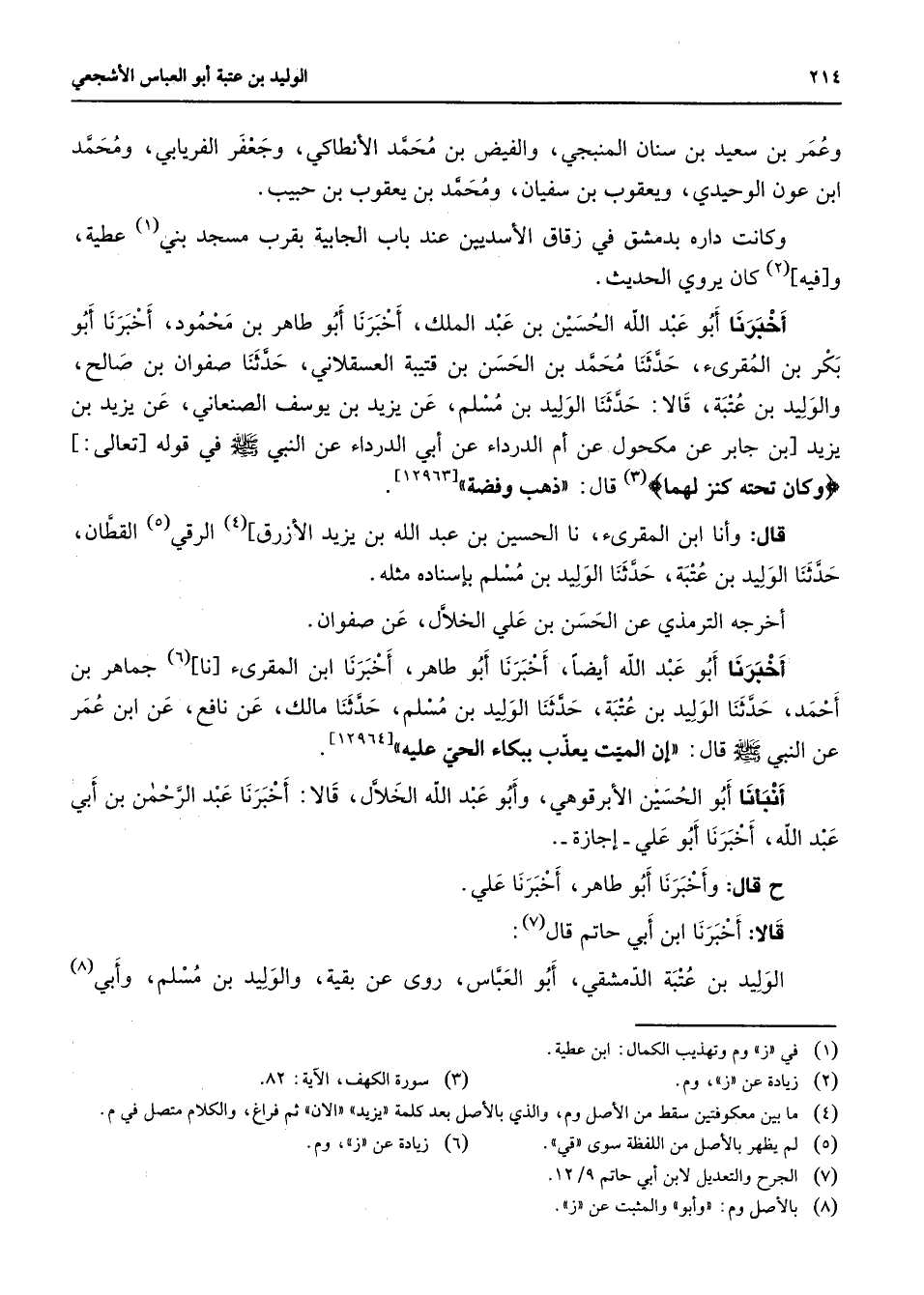 وعمر بن سعيد بن سنان المنبجي والفيض بن محمد الأنطاكي وجعفر الفريابي ومحمد ابن عون الوحيدي ويعقوب بن سفيان ومحمد بن سعقوب بن حبيب وكانت داره بدمشق في زقاق الأسديين عند باب الجابية بقرب مسجد بني (1) عطية وفيه (2) كان يروي الحديث أخبرنا أبو عبد الله الحسين بن عبد الملك أخبرنا أبو طاهر بن محمود أخبرنا أبو بكر بن المقرئ حدثنا محمد بن الحسن بن قتيبة العسقلاني حدثنا صفوان بن صالح والوليد بن عتيبة قالا حدثنا الوليدبم مسلم عن يزيد بن يوسف الصنعاني عن يزيد بن يزيد بن جابر عن مكحول عن أم الدرداء عن أبي الدرداء عن النبي (صلى الله عليه وسلم) في قوله تعالى " وكان تحته كنز لهما (3) " قال ذهب وفضة قال وانا ابن المقرئ نا الحسين بن عبد الله بز يزيد الأزرق (4) الرقي (5) القطان حدثنا الوليد بن عتبة حدثنا الوليد بن مسلم بإسناده مثله أخرجه الترمذي عن الحسن بن علي الخلال عن صفوان - أخبرنا أبو عبد الله أيضا أخبرنا أبو طاهر أخبرنا ابن المقرئ نا (6) جماهر بن أحمد حدثنا الوليد بن عتبة حدثنا الوليد بن مسلم حدثنا مالك عن نافع عن ابن عمر عن النبي (صلى الله عليه وسلم) قال إن الميت يعذب ببكاء الحي عليه أنبأنا أبو الحسين الأبرقوهي وأبو عبد الله الخلال قالا أخبرنا عبد الرحمن بن أبي عبد الله عبد أخبرنا أبو علي إجازة قال وأخبرنا أبو طاهر أخبرنا علي قالا أخبرنا ابن أبي حاتم قال (7) الوليد بن عتبة الدمشقي أبو العباس روى عن بقية والوليد بن مسلم وأبي (8)