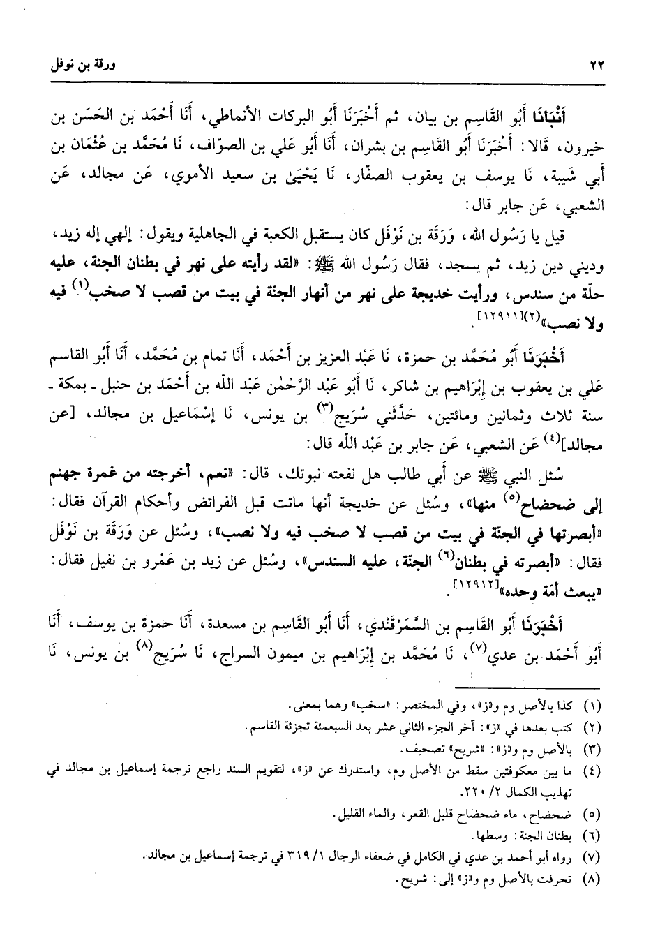 أنبأنا أبو القاسم بن بيان ثم أخبرنا أبو البركات الأنماطي أن أحمد بن الحسن بن خيرون قالا أخبرنا أبو القاسم بن بشران أن أبو علي بن الصواف نا محمد بن عثمان بن أبي شيبة نا يوسف بن يعقوب الصفار نا يحيى بن سعيد الأموي عن مجالد عن الشعبي عن جابر قال قيل يا رسول الله ورقة بن نوفل كان يستقب الكعبة في الجاهلية ويقول إلهي إله زيد وديني دين زيد ثم يسجد فقال رسول الله (صلى الله عليه وسلم) لقد رأيته على نهر في بطنان الجنة عليه حله من سندس ورأيت خديجة على نهر من أنهار الجنة في بيت من قصب لا صخب (1) فيه ولا نصب (2)
