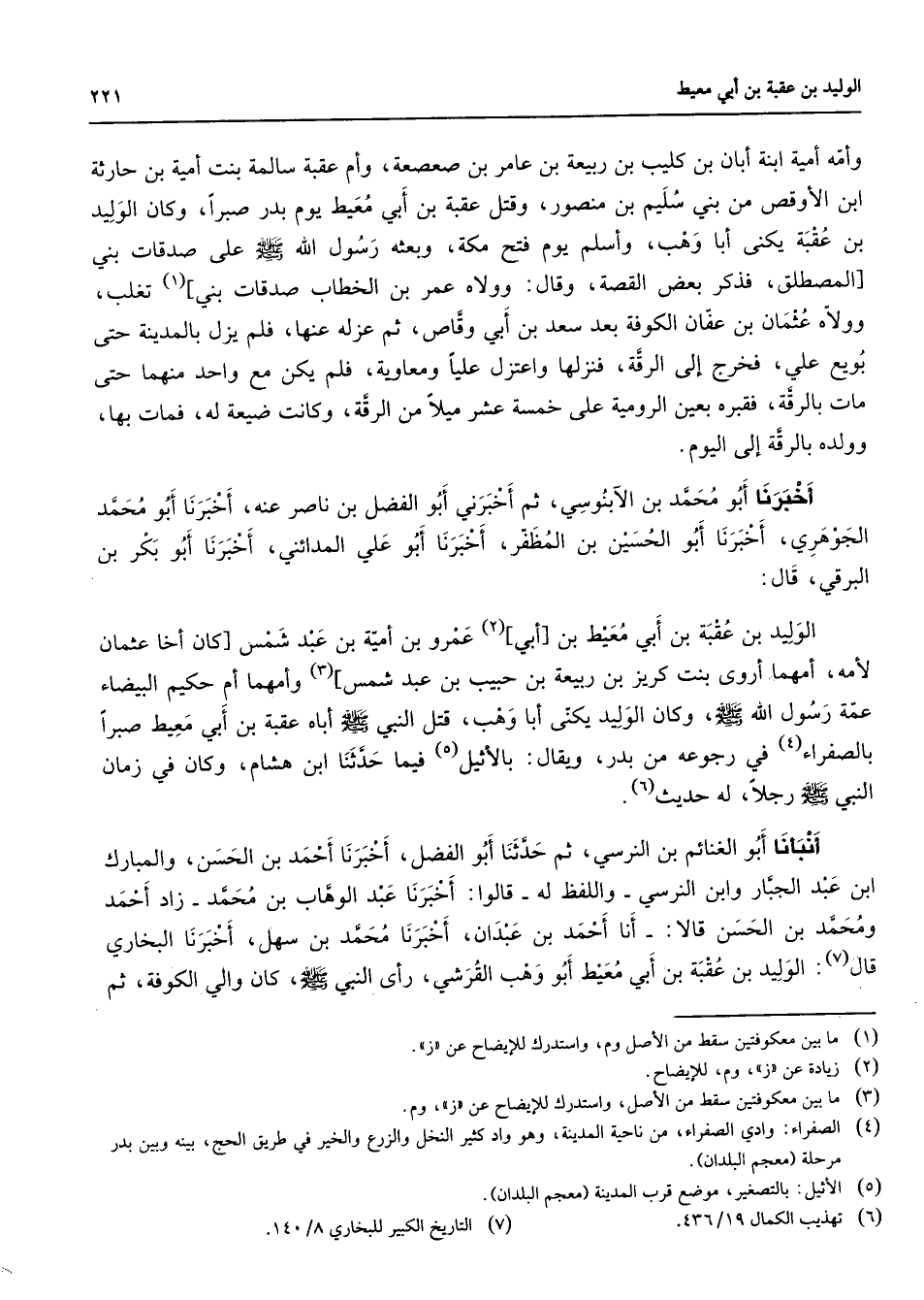 وأمه أمية ابنة أبان بن كليب بن ربيعة بن عامر بم صعصعة وأم عقبة سالمة بنت أمية بن حارثة ابن الأوقص من بني سليم بن منصور وقتل عقبة بن أبي معيط يوم صبرا وكان الوليد بن عقبة يكنى أبا وهب وأسلم يوم فتح مكة وبعثه رسول الله (صلى الله عليه وسلم) على صدقات بني الصطلق فذكر بعض القصة وقال وولاه عمر بن الخطاب صدقات بنب (1) تغلب وولاه عثمان بن عفان الكوفة بن سعد بن أبي وقاص ثم عزله عنها فلم يزل بالمدينة حتى بويع علي فخرج إلى الرقة فنزلها واعتزل عليا ومعاوية فلم يكن مع زاحد منهما حتى مات بالرقة فقبره بعين الرومية على خمسة عشر ميلا من الرقة وكانت ضيعة له فمات بها وولد بالرقة إلى اليوم أخبرنا أبو محمد بن الآبنوسي ثم أخبرني أبو الفضل بن ناصر عنه أخبرنا أبو محمد الجوهري أخبرنا أبو الحسين بن المظفر أخبرنا أبو علي المدائني أخبرنا أبو بكر بن البرقي قال الوليد بن عقبة بن أبي معيط بن أبي (2) عمرو بن أمية بن عبد شمس كان أخا عثمان لأمه أمهما أروى بنت كريز بن ربيعة بن حبيب بن عبد شمس (3) وأمهما أم حكيم البيضاء عمة رسول الله (صلى الله عليه وسلم) وكان الوليد يكنى أبا وهب قتل النبي (صلى الله عليه وسلم) أباه عقبة بن أبي معيط صبرا بالصفراء (4) في رجوعه من بدر ويقال بالأثيل (5) فينا حدثنا ابن هشام وكان في زمان النبي (صلى الله عليه وسلم) رجلا له حديث (6) أنبأنا أبو الغنائم بن النرسي ثم حدثنا أبو الفضل أخبرنا أحمد بن الحسن والمبارك ابن عبد الجبار وابن النرسي واللفظ له قالوا أخبرنا عبد الوهاب بن محمد زاد أحمد ومحمد بن الحسن قالا أنا أحمد بن عبدان أخبرنا محمد بن سهل أخبرنا البخاري قال الوليد بن عقبة بن أبي معيط أبو وهب القرشي رأى النبي (صلى الله عليه وسلم) كان والي الكوفة ثم