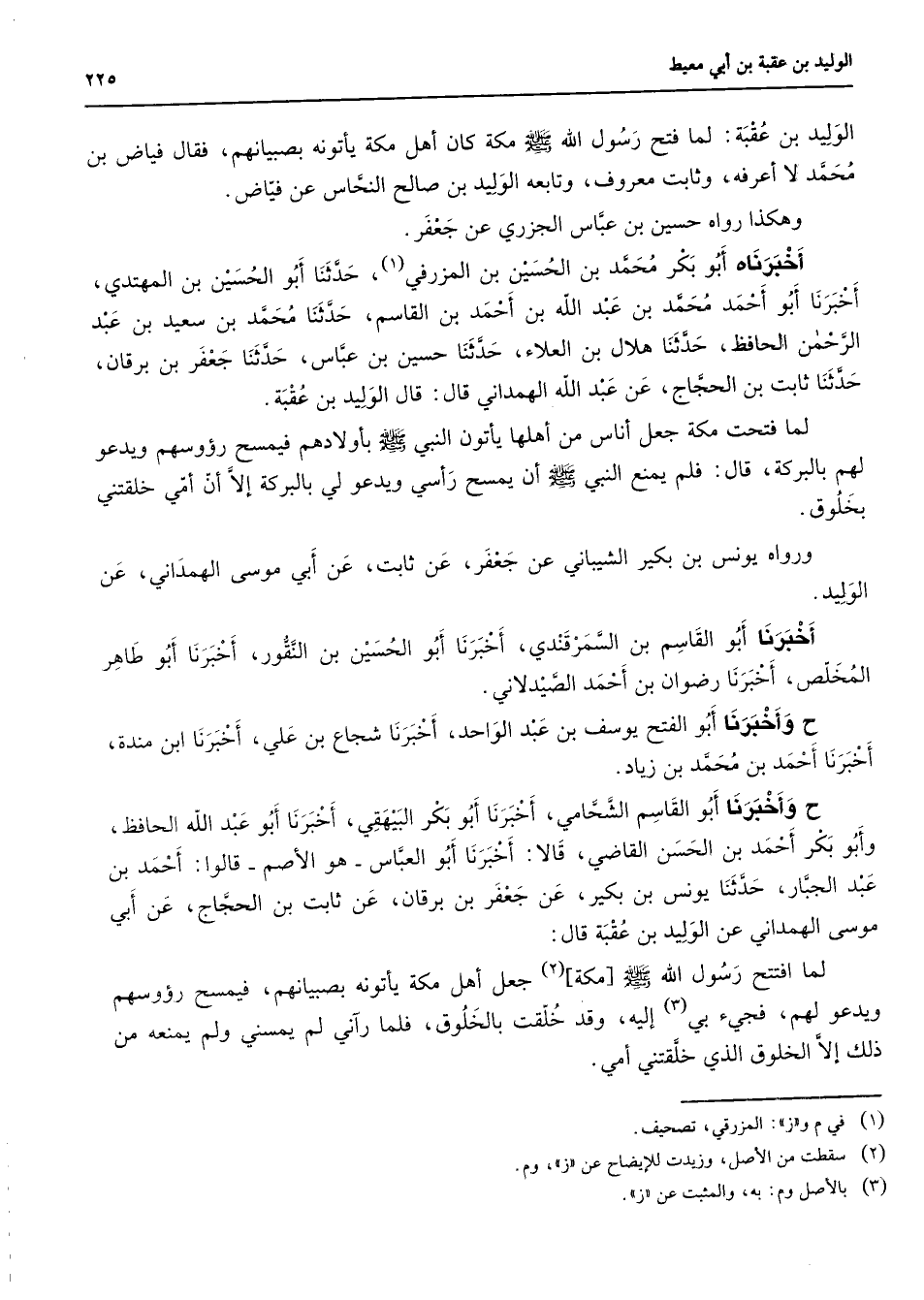 الوليد بن عقبة لما فتح رسول الله (صلى الله عليه وسلم) مكة كان أهل مكة يأتونه بصبيانهم فقال فياض بن محمد لا أعرفه وثابت معروف وتابعه الوليد بن صالح النحاس عن فياض وهكذا رواه حسين بن عباس الجزري عن جعفر أخبرناه أبو بكر محمد بن الحسين بن المزرفي (1) حدثنا أبو الحسين بن المهتدي أخبرنا أبو أحمد محمد بن عبد الله بن أحمد بن القاسم حدثنا محمد بن سعيد بن عبد الرحمن الحافظ حدثنا هلال بن العلاء حدثنا حسين بن عباس حدثنا جعفر بن برقان حدثنا ثابت بن الحجاج عن عبد الله الهمداني قال قال الوليد بن عقبة لما فتحت مكة جعل أناس من أهلها يأتون النبي (صلى الله عليه وسلم) بأولادهم فيمسح رؤوسهم ويدعو لهم بالبركة قال فلم يمنع النبي (صلى الله عليه وسلم) أن يمسح رأسي ويدعو لي بالبركة إلا أن أمي خلقتني بخلوق ورواه يونس بن بكير الشيباني عن جعفر عن ثابت عن أبي موسى الهمداني عن الوليد أخبرنا أبو القاسم بن السمرقندي أخبرنا أبو الحسين بن النقور أخبرنا أبو طاهر المخلص أخبرنا رضوان بن أحمد الصيدلاني وأخبرنا أبو الفتح يوسف بن عبد الواحد أخبرنا شجاع بن علي أخبرنا ابن منده أخبرنا أحمد بن محمد بن زياد وأخبرنا أبو القاسم الشحامي أخبرنا أبو بكر البيهقي أخبرنا أبو عبد الله الحافظ وأبو بكر أحمد بن الحسن القاضي قالا أخبرنا أبو العباس هو الأصم قالوا أحمد بن عبد الجبار حدثنا يونس بن بكير عن جعفر بن برقان عن ثابت بن الحجاج عن أبي موسى الهمداني عن الوليد بن عقبة قال لما افتتح رسول الله (صلى الله عليه وسلم) مكة (2) جعل أهل مكة يأتونه بصبيانهم فيمسح رؤوسهم ويدعو لهم فجئ بي (3) إليه وقد خلقت بالخلوق فلما رآني لم يمسني ولم يمنعه من ذلك إلا الخلوق الذي خلقتني أمي