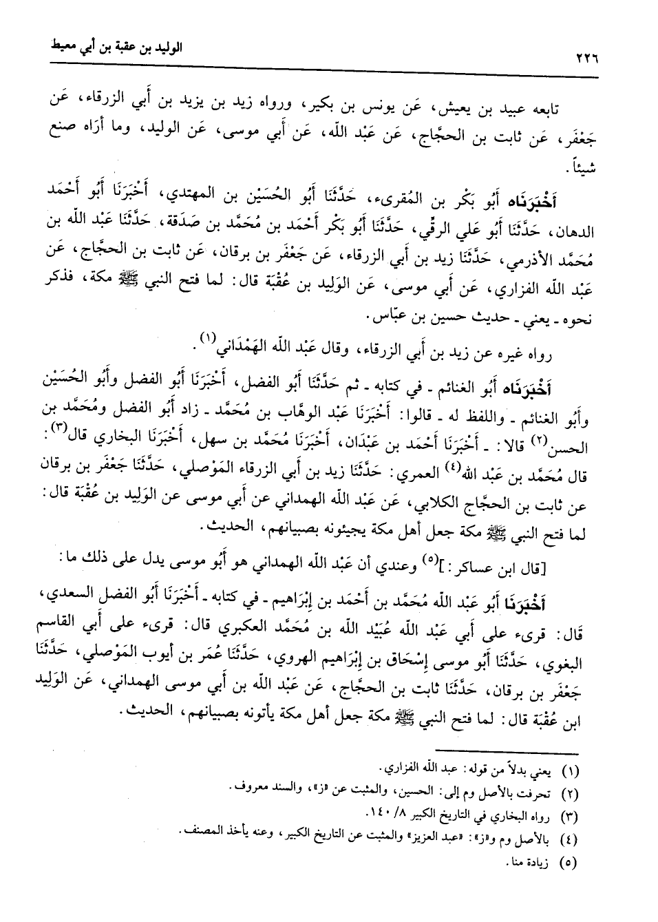 تابعه عبيد بن يعيش عن يونس بن بكير ورواه زيد بن يزيد أبي الزرقاء عن جعفر عن ثابت بن الحجاج عن عبد الله عن أبي موسى عن الوليد وما أراه صنع شيئا أخبرناه أبو بكر بن المقرئ حدثنا أبو الحسين بن المهتدي أخبرنا أبو أحمد الدهان حدثنا أبو علي الرقي حدثنا أبو بكر أحمد بن محمد بن صدقة حدثنا عبد الله بن محمد الأذرمي حدثنا زيد بن أبي الزرقاء عن جعفر بن برقان عن ثابت بن الحجاج عن عبد الله الفزاري عن أبي موسى عن الوليد بن عقبة قال لما فتح النبي (صلى الله عليه وسلم) مكة فذكر نحوه يعني حديث حسين بن عباس رواه غيره عن زيد بن أبي الزرقاء وقال عبد الله الهمداني (1) أخبرناه أبو الغنائم في كتابه ثم حدثنا أبو الفضل أخبرنا أبو الفضل وأبو الحسين وأبو الغنائم واللفظ له قالو أخبرنا عبد الوهاب بن محمد زاد أبو الفضل ومحمد بن الحسن (2) قالا أخبرنا أحمد بن عبدان أخبرنا محمد بن سهل أخبرنا البخاري قال (3) قال محمد بن عبد الله (4) العمري حدثنا زيد بن أبي الزرقاء الموصلي حدثنا جعفر بن برقان عن ثابت بن الحجاج الكلابي عن عبد الله الهمداني عن أبي موسى عن الوليد بن عقبة قال لما فتح النبي (صلى الله عليه وسلم) مكة جعل أهل مكة يجيئونه بصبيانهم الحديث قال ابن عساكر (5) وعندي أن عبد الله الهمداني هو أبو موسى يدل على ذلك ما أخبرنا أبو عبد الله محمد بن أحمد بن إبراهيم في كتابه أخبرنا أبو الفضل السعدي قال قرئ على أبي عبد الله عبيد الله بن محمد العكبري قال قرئ على أبي القاسم البغوي حدثنا أبو موسى إسحاق بن إبراهيم الهروي حدثنا عمر بن أيوب الموصلي حدثنا جعفر بن برقان حدثنا ثابت بن الحجاج عن عبد الله بن أبي موسى الهمداني عن الوليد ابن عقبة قال لما فتح النبي (صلى الله عليه وسلم) مكة جعل أهل مكة يأتونه بصبيانهم الحديث