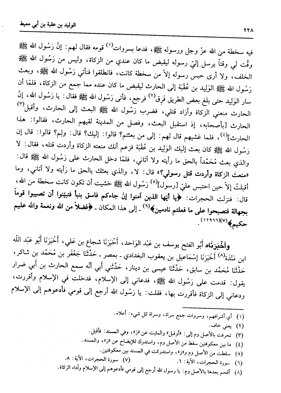 فيه سخطه من ألله عز وجل ورسوله (صلى الله عليه وسلم) فدعا بسروات (1) قومه فقال لهم إن رسول الله (صلى الله عليه وسلم) وقت لي وقتا يرسل إلي رسوله ليقبض ما كان عندي من الزكاة وليس من رسول الله (صلى الله عليه وسلم) الخلف ولا أرى حبس رسوله إلا من سخطه كانت فانطبقوا فنأني رسول الله (صلى الله عليه وسلم) وبعث رسول الله (صلى الله عليه وسلم) الوليد بم عقبة إلى الحارث ليقبض ما كان عنده مما جمع من الزكاة فلما أن سار الوليد حتى بلغ بعض الطريق فرق (2) فرجع فأتى رسول الله (صلى الله عليه وسلم) فقال يا رسول الله إن الحارث منعني الزكاة وأراد قتلي فضرب رسول الله (صلى الله عليه وسلم) البعث إلى الحارث وأقبل (3) الحارث بأصحابه إذ استقبل البعث وفصل من المدينة لقيهم الحارث فقالوا هذا الحارث فلما غشيهم قال لهم إلى من بعثتم قالوا إليك قال ولم قالوا قال إن رسول الله (صلى الله عليه وسلم) كان بعث إليك الوليد بن عقبة فزعم أنك منعته الزكاة وأردت قتله فقال لا والذي بعث محمدا بالحق ما رأيته ولا أتاني فلما دخل الحارث على رسول الله (صلى الله عليه وسلم) قال منعت الزكاة وأردت قتل رسولي قال لا والذي بعثك بالحق ما رأيته ولا أتاني وما أقبلت إلا حين احتبس علي رسول (5) رسول الله (صلى الله عليه وسلم) خشيت أن تكون كانت سخطه من الله قال فنزلت الحجرات " يا أيها الذين آمنوا إن جاءكم فاسق بنبأ فتبينوا أن تصيبوا قوما بجهالة فتصبحوا على ما فعلتم نادمين (6) إلى هذا المكان " فضلا من الله ونعمة والله عليم حكيم (7) " وأخبرناه أبو الفتح يوسف بن عبد الواحد أخبرنا شجاع بن علي أخبرنا أبو عبد الله ابن منده (8) أخبرنا إسماعيل بن يعقوب البغدادي بمصر حدثنا جعفر بن محمد بن شاكر حدثنا محمد بن سابق حدثنا عيسى بن دينار حدثني أبي أنه سمع الحارث بن أبي ضرار بقول قدمت على رسول الله (صلى الله عليه وسلم) فدعاني إلى الإسلام فدخلت في الإسلام وأقررت ودعاني إلى الزكاة فأقررت بها فقلت يا رسول الله أرجع إلى قومي فأدعوهم إلى الإسلام