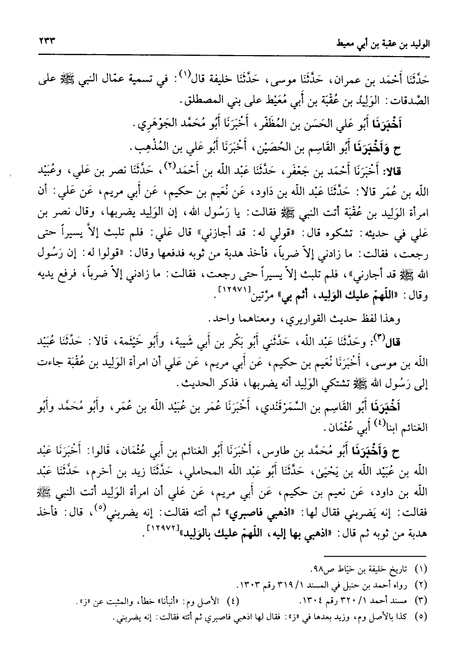 " حدثنا أحمد بن عمران حدثنا موسى حدثنا خليفة قال (1) في تسمية عمال النبي (صلى الله عليه وسلم) على الصدقات الوليد بن عقبة بن أبي معيط على بني المصطلق " أخبرنا أبو علي الحسن بن المظفر أخبرنا أبو محمد الجوهري وأخبرنا أبو القاسم بن الحصين أخبرنا أبو علي بن المذهب قالا أخبرنا أحمد بن جعفر حدثنا عبد الله بن أحمد (2) حدثنا نصر بن علي وعبيد الله بن عمر قالا حدثنا عبد الله بن داود عن نعيم بن حكيم عن أبي مريم عن علي أن امرأة الوليد بن عقبة أتت النبي (صلى الله عليه وسلم) فقالت يا رسول الله إن الوليد يضربها وقال نصر بن علي في حديثه تشكوه قال قولي له قد أجازني قال علي فلم تلبث إلا يسيرا حتى رجعت فقالت ما زادني إلا ضربا فأخذ هدبة من ثوبة فدفعها وقال قولوا له إن رسول الله (صلى الله عليه وسلم) قد أجارني فلم تلبث إلا يسيرا حتى رجعت فقالت ما زادني إلا ضربا فرفع يديه وقال اللهم عليك الوليد أثم بي مرتين وهذا لفظ حديث القواريري ومعناهما واحد قال (3) وحدثنا عبد الله حدثني أبو بكر بن أبي شيبة وأبو خيثمة قالا حدثنا عبيد الله بن موسى أخبرنا نعيم بن حكيم عن أبي مريم عن علي أن امرأة الوليد بن عقبة جاءت إلى رسول الله (صلى الله عليه وسلم) تشتكي الوليد أنه يضربها فذكر الحديث أخبرنا أبو القاسم بن السمرقندي أخبرنا عمر بن عبيد الله بن عمر وأبو محمد وابو الغنائم ابنا (4) أبي عثمان وأخبرنا أبو محمد بن طاوس أخبرنا أبو الغنائم بن أبي عثمان قالوا أخبرنا عبد الله بن عبيد الله بن يحيى حدثنا أبو عبد الله المحاملي حدثنا زيد بن أخرم حدثنا عبد الله بن داود عن نعيم بن حكيم عن أبي مريم عن علي أن امرأة الوليد أتت النبي (صلى الله عليه وسلم) فقالت إنه يضربني فقال لها اذهبي فاصبري ثم أتته فقالت إنه يضربني (5) قال فأخذ هدية من ثوبه ثم قال اذهبي بها إليه اللهم عليك بالوليد