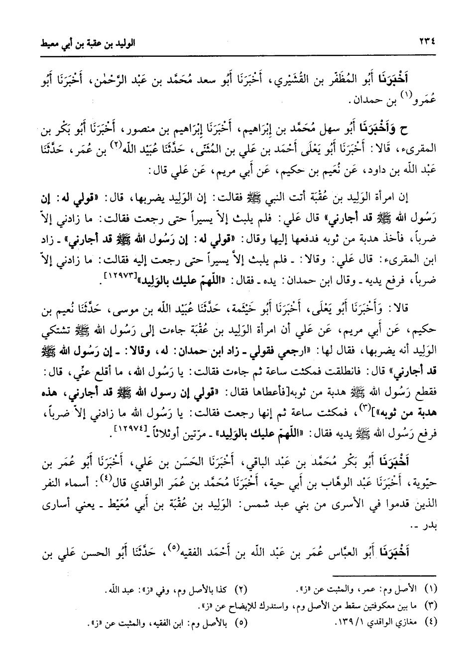 أخبرنا أبو المظفر بن القشيري أخبرنا أبو سعد محمد بن عبد الرحمن أخبرنا أبو عمرو (1) بن حمدان وأخبرنا أبو سهل محمد بن إبراهيم أخبرنا إبراهيم بن منصور أخبرنا أبو بكر بن المقرئ قالا أخبرنا أبو يعلى أحمد بن علي بن المثنى حدثنا عبيد الله (2) بن عمر حدثنا عبد الله بن داود عن نعيم بن حكيم عن أبي مريم عن علي قال إن امرأة الوليد بن عقبة أتت النبي (صلى الله عليه وسلم) فقالت إن الوليد يضربها قال قولي له إن رسول الله (صلى الله عليه وسلم) قد أجارني قال علي فلم يلبث إلا يسيرا حتى رجعت فقالت ما زادني إلا ضربا فأخذ هدبة من ثوبه فدفعها إليها وقال قولي له إن رسول الله (صلى الله عليه وسلم) قد أجارني زاد ابن المقرئ قال علي وقالا فلم يلبث إلا يسيرا حتى رجعت إليه فقالت ما زادني إلا ضربا فرفع يديه وقال ابن حمدان يده فقال اللهم عليك بالوليد قالا وأخبرنا أبو يعلى أخبرنا أبو خيثمة حدثنا عبيد الله بن موسى حدثنا نعيم بن حكيم عن أبي مريم عن علي أن امرأة الوليد بن عقبة جاءت إلى رسول الله (صلى الله عليه وسلم) تشتكي الوليد أنه يضربها فقال لها ارجعي فقولي زاد ابن حمدان له وقالا إن رسول الله (صلى الله عليه وسلم) قد أجارني قال فانطلقت فمكثت ساعة ثم جاءت فقالت يا رسول الله ما أقلع عني قال فقطع رسول الله (صلى الله عليه وسلم) هدبة من ثوبه فأعطاها فقال قولي إن رسول الله (صلى الله عليه وسلم) قد أجارني هذه هدبة من ثوبه (3) فمكث ساعة ثم أنها رجعت فقالت يا رسول الله ما زادني إلا ضربا فرفع رسول الله (صلى الله عليه وسلم) يديه فقال اللهم عليك بالوليد مرتين أو ثلاثا أخبرنا أبو بكر محمد بن عبد الباقي أخبرنا الحسن بن علي أخبرنا أبو عمر بن حيوية أخبرنا عبد الوهاب بن أبي حية أخبرنا محمد بن عمر الواقدي قال (4) أسماء النفر الذين قدموا في الأسرى من بني عبد شمس الوليد بن عقبة بن أبي معيط يعني أسارى بدر أخبرنا أبو العباس عمر بن عبد الله بن أحمد الفقيه (5) حدثنا أبو الحسن علي بن