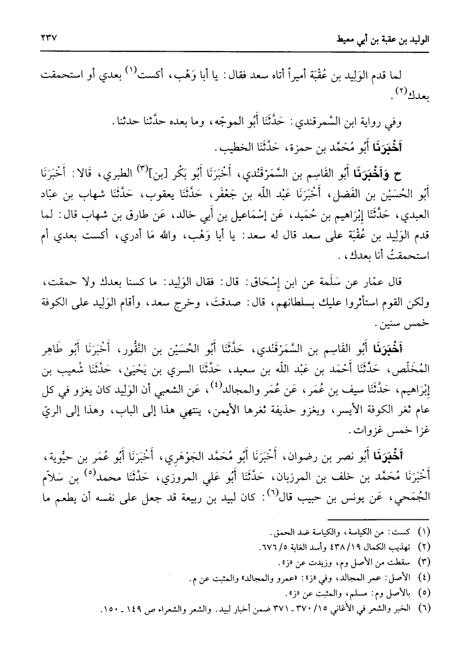 لما قدم الوليد بن عقبة أميرا أتاه سعد فقال يا أبا وهب أكست (1) بعدي أو استحمقت بعدك (2) وفي رواية ابن السمر قندي حديثا أبو الموجة وما بعده حدثنا حدثنا أخبرنا أبو محمد بن حمزة حدثنا الخطيب ح وأخبرنا أبو القاسم بن السمرقندي أخبرنا أبو بكر بن (3) الطبري قالا أخبرنا أبو الحسين بن الفضل أخبرنا عبد الله بن جعفر حدثنا بعقوب حدثنا شهاب بن عباد العبدي حدثنا إبراهيم بن حميد عن إسماعيل بن أبي خالد عن طارق بن شهاب قال لما قدم الوليد بن عقبة على سعد قال له سعد يا أبا وهب والله ما أدري أكست بعدي أم استحقمت أنا بعدك قال عمار عن سلمة عن ابن إسحاق قال فقال الوليد ما كسنا بعدك ولا حمقت ولكن القوم استأثروا عليك بسلطانهم قال صدقت وخرج سعد وأقام الوليد على الكوفة خمس سنين أخبرنا أبو القاسم بن السمرقندي حدثنا أبو الحسين بن النقور أخبرنا أبو طاهر المخلص حدثنا أحمد بن عبد الله بن سعيد حدثنا السري بن يحيى حدثنا شعيب بن إبراهيم حدثنا سيف بن عمر عن عمر والمجالد (4) عن الشعبي أن الوليد كان يغزو في كل عام ثغر الكوفة الأيسر ويغزو حذيفة ثغرها الأيمن ينتهي هذا إلى الباب وهذا إلى الري غزا خمس غزوات أخبرنا أبو نصر بن رضوان أخبرنا أبو محمد الجوهري أخبرنا أبو عمر بن حيوية أخبرنا محمد بن خلف بن المرزبان حدثنا أبو علي المرزوي حدثنا محمد (5) بن سلام الجمحي عن يونس بن حبيب قال (6) كان لبيد بن ربيعة قد جعل على نفسه أن يطعم ما