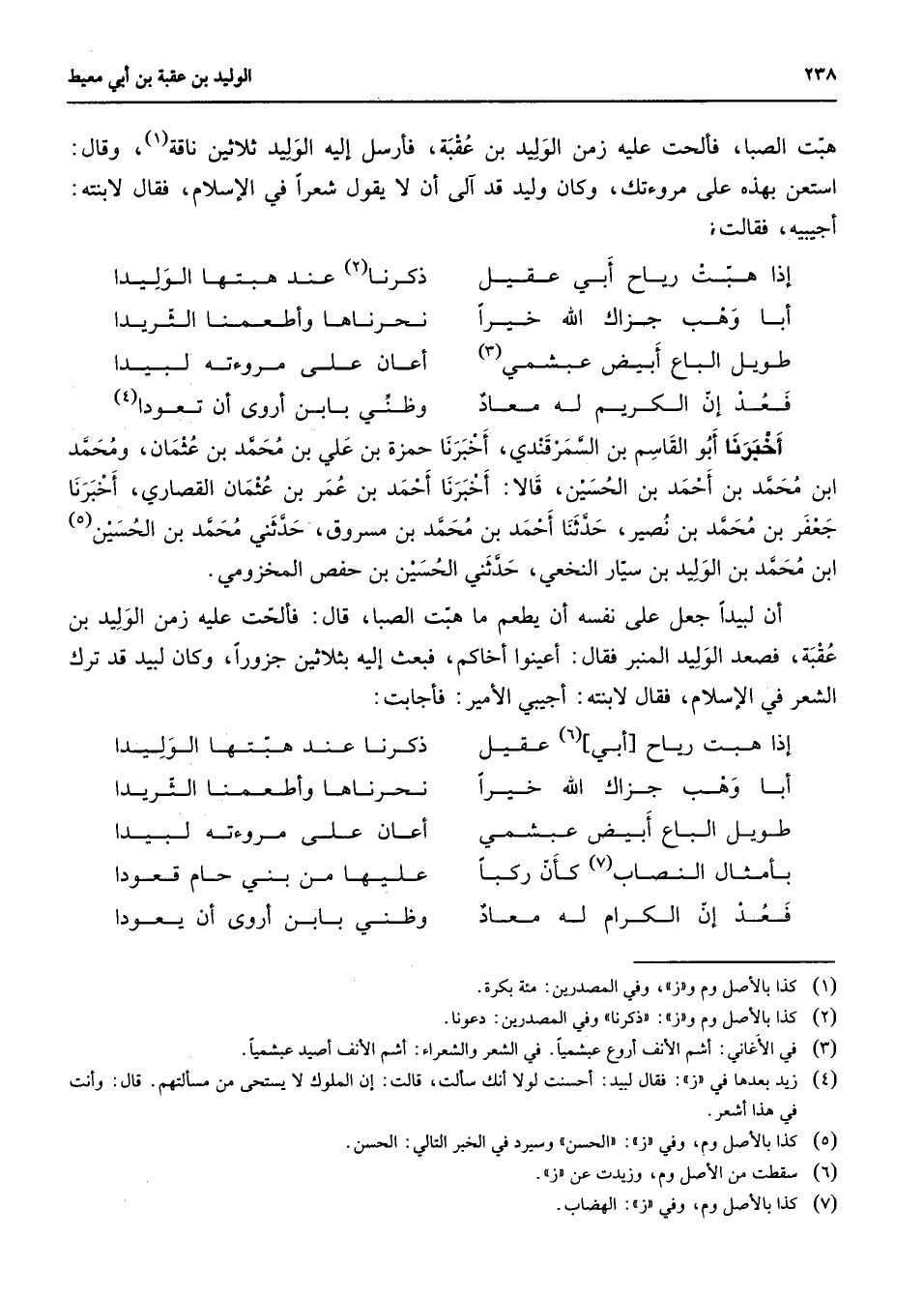 هبت الصبا فألحت عليه زمن الوليد بن عقبة فأرسل إليه الوليد ثلاثين ناقة (1) وقال استعن بهذه على مروءتك وكان وليد قد آلى أن لا يقول شعرا في الإسلام فقال لابنته أجيبيه فقالت * إذا هبت رياح أبي عقيل * ذكرنا (2) عند هبتها الوليدا أبا وهب جزاك الله خيرا * نحرناها وأطعمنا الثريرا * * طويل الباع أبيض عبشمي (3) * أعان على مروءته لبيدا فعد إن الكريم له معاد * وظني بابن أروى أن تعودا (4) * أخبرنا أبو القاسم بن السمرقندي أخبرنا حمزة بن علي بن محمد بن عثمان ومحمد ابن محمد بن أحمد بن الحسين قالا أخبرنا أحمد بن عمر بن عثمان القصاري أخبرنا جعفر بن محمد بن نصير حدثنا أحمد بن محمد بن مسروق حدثني محمد بن الحسين (5) ابن محمد بن الوليد بن سيار النخعي حدثني الحسين بن حفص المخزومي أن لبيدا جعل على نفسه أن يطعم ما هبت الصبا قال فألحت عليه زمن الوليد بن عقبة فصعد الوليد المنبر فقال أعينوا أخاكم فبعث إليه بثلاثين جزورا وكان لبيد قد ترك الشعر في الإسلام فقال لابنته أجيبي الأمير فأجابت * إذا هبت رياح أبي (6) عقيل * ذكرنا عند هبتها الوليدا أبا وهب جزاك الله خيرا * نحرناها وأطعمنا الثريدا طويل الباع أبيض عبشمي * أعان على مروءته لبيدا بأمثال النصاب (7) كأن ركبا * عليها من بني حام قعودا فعد إن الكرام له معاد * وظني بابن أروى أن يعودا *