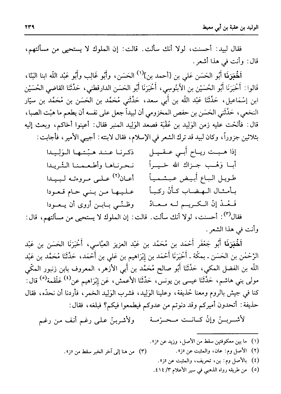 فقال لبيد أحسنت لولا أنك سألت قالت إن الملوك لا يستحيى من مسألتهم قال وأنت في هذا أشعر أخبرنا أبو الحسن علي بن أحمد (1) بن الحسن وأبو غالب وأبو عبد الله ابنا البنا قالوا أخبرنا أبو الحسين بن الآبنوسي أخبرنا أبو الحسن الدارقطني حدثنا القاضي الحسين ابن إسماعيل حدثنا عبد الله بن أبي سعد حدثني محمد بن الحسن بن محمد بن سيار النخعي حدثني الحسن بن حفص المخزومي أن لبيدا جعل على نفسه أن يطعم ما هبت الصبا قال فألحت عليه زمن الوليد بن عقبة فصعد الوليد المنبر فقال أعينوا أخاكم وبعث إليه بثلاثين جزورا وكان لبيد قد ترك الشعر في الإسلام فقال لابنته أجيبي الأمير فأجابت * إذا هبت رياح أبي عقيل * ذكرنا عند هبتها الوليدا أبا وهب جزاك الله خيرا * نحرناها وأطعمنا الثريدا طويل الباع أبيض عبشميا * أعان (2) على مروءته لبيدا بأمثال الهضاب كأن ركبا * عليها من بني حام قعودا فعد إن الكريم له معاد * وظني بابن أروى أن يعودا * فقال (3) أحسنت لولا أنك سألت قالت إن الملوك لا يستحيى من مسألتهم قال وأنت في هذا الشعر أخبرنا أبو جعفر أحمد بن محمد بن عبد العزيز العباسي أخبرنا الحسن بن عبد الرحمن بن الحسن بمكة أخبرنا أحمد بن إبراهيم بن علي بن أحمد حدثنا محمد بن عبد الله بن الفضل المكي حدثنا أبو صالح محمد بن أبي الأزهر المعروف بابن زنبور المكي مولى بني هاشم حدثنا عيسى بن يونس حدثنا الأعمش عن إبراهيم عن (4) علقمة (5) قال كنا في جيش بالروم ومعنا حذيفة وعلينا الوليد فشرب الوليد الخمر فأردنا أن نحده فقال حذيفة أتحدون أميركم وقد دنوتم من عدوكم فيطعموا فيكم فبلغه فقال * لأشربن وإن كانت محرمة * ولأشربن على رغم أنف من رغم *