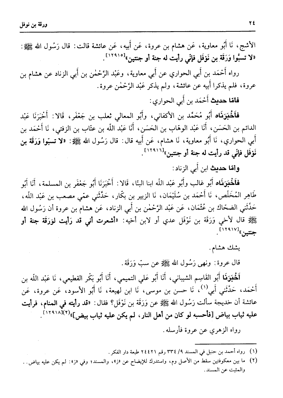 الأشج نا أبو معاوية عن هشام بن عروة عن أبيه عن عائشة قالت قال رسول الله (صلى الله عليه وسلم) لا تسبوا ورقة بن نوفل فإني رأيت له جنة أو جنتين