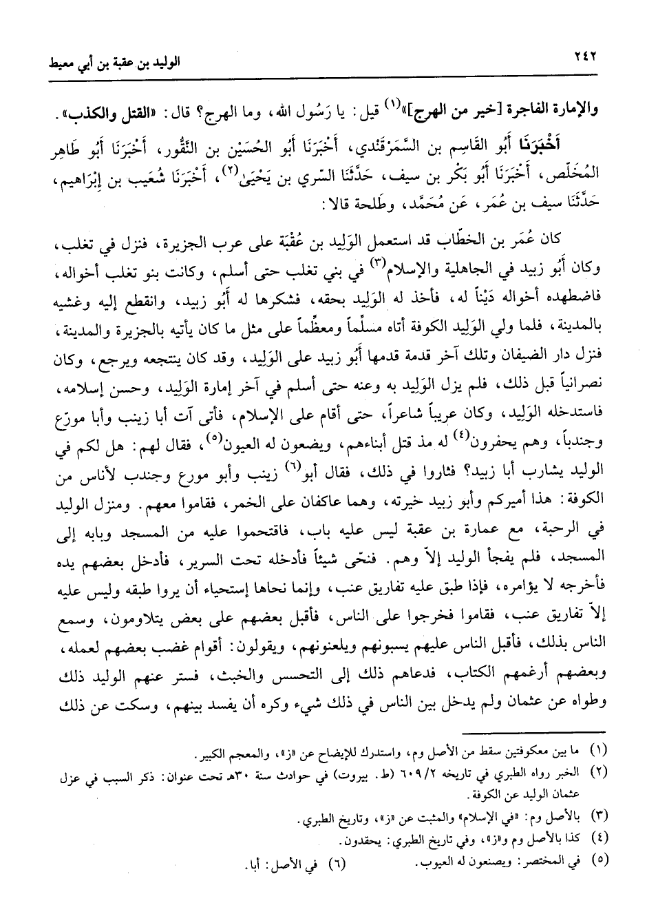 والإمارة الفاجرة خير من الهرج (1) قيل يا رسول الله وما الهرج قال القتل والكذب أخبرنا أبو القاسم بن السمرقندي أخبرنا أبو الحسين بن النقور أخبرنا أبو طاهر المخلص أخبرنا أبو بكر بن سيف حدثنا السري بن يحيى (2) أخبرنا شعيب بن إبراهيم حدثنا سيف بن عمر عن محمد وطلحة قالا كان عمر بن الخطاب قد استعمل الوليد بن عقبة على عرب الجزيرة فنزل في تغلب وكان أبو زبيد في الجاهلية والإسلام (3) في بني تغلب حتى أسلم وكانت بنو تغلب أخواله فاضطهده أخواله دينا له فأخذ له الوليد بحقه فشكرها له أبو زبيد وانقطع إليه وغشيه بالمدينة فلما ولي الوليد الكوفة أتاه مسلما ومعظما على مثل ما كان يأتيه بالجزيرة والمدينة فنزل دار الضيفان وتلك آخر قدمه قدمها أبو زبيد على الوليد وقد كان ينتجعه ويرجع وكان نصرانيا قبل ذلك فلم يزل الوليد به وعنه حتى أسلم في آخر إمارة الوليد وحسن إسلامه فاستدخله الوليد وكان عربيا شاعرا حتى أقام على الإسلام فأتى آت أبا زينب وأبا مورع وجنديا وهم يحفرون (4) له مذ قتل أبناءهم ويضعون له العيون (5) فقال لهم هل لكم في الوليد يشارب أبا زبيد فثاروا في ذلك فقال أبو (6) زينب وأبو مورع وجندب لأناس من الكوفة هذا أميركم وأبو زبيد خيرته وهما عاكفان على الخمر فقاموا معهم ومنزل الوليد في الرحبة مع عمارة بن عقبة ليس عليه باب فاقتحموا عليه من المسجد وبابه إلى المسجد فلم يفجأ الوليد إلا وهم فنحى شيئا فأدخله تحت السرير فأدخل بعصهم يده فأخرجه لا يؤامره فإذا طبق عليه تفاريق عنب وإنما نحاها استحياء أن يروا طبقة وليس عليه إلا تفاريق عنب فقاموا فخرجوا على الناس فأقبل بعضهم على بعض يتلاومون وسمع الناس بذلك فأقبل الناس عليهم يسبونهم ويلعنونهم ويقولون أقوام غضب بعضهم لعمله وبعضهم أرغمهم الكتاب فدعاهم ذلك إلى التحسس والخبث فستر عنهم الوليد ذلك وطواه عن عثمان ولم يدخل بين الناس في ذلك شئ وكره أن يفسد بينهم وسكت عن ذلك
