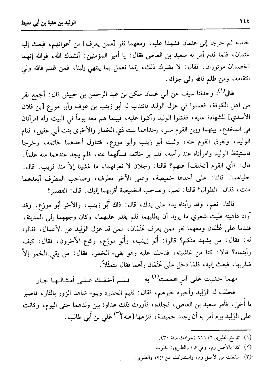 خاتمه ثم خرجا إلى عثمان فشهدا عليه ومعهما نفر ممن يعرف من أعوانهم فبعث إليه عثمان فلما قدم أمر به سعيد بن العاص فقال يا أمير المؤمنين أنشدك الله فوالله إنهما لخصمان موتوران فقال لا يضرك ذلك إنما نعمل بما ينتهي إلينا فمن ظلم فالله ولي انتقامه ومن ظلم فالله ولي جزائه قال (1) وحدثنا سيف عن أبي غسان سكن بن عبد الرحمن بن حبيش قال أجمع نفر من أهل الكوفة فعملوا في عزل الوليد فانتدب له أبو زينب بن عوف وأبو مورع بن فلان الأسدي للشهادة عليه فغشوا الوليد وأكبوا عليه فبنما هم معه يوما في البيت وله امرأتان في المخدع بينهما وبين القوم ستر إحداهما بنت ذي الخمار والأخرى بنت أبي عقيل فنام الوليد وتفرق القوم عنه وثبت أبو زينب وأبو مورع فتناول أحدهما خاتمه وخرجا فاستيقظ الوليد وامرأتاه عند رأسه فلم ير خاتمه فسألهما عنه فلم يجد عندهما منه علما قال فأي القوم تخلف عنهم قالتا رجلان لا نعرفهما ما غشينا إلا منذ قريب قال حلياهما قالتا على أحدها خميصة وعلى الآخر مطرف وصاحب المطرف أبعدهما منك فقال الطوال قالتا نعم وصاحب الخميصة أقربهما إليك قال القصير قالتا نعم وقد رأيناه يده على يدك قال ذاك أبو زينب والآخر أبو مورع وقد أراد داهيته فليت شعري ما يريد أن يطلبهما فلم يقدر عليهما وكان وجههما إلى المدينة فقدما على عثمان ومعهما نفر ممن يعرف عثمان ممن قد عزل الوليد عن الأعمال فقالوا له فقال من يشهد منكم قالوا أبو زينب وأبو مورع وكاع الآخرون فقال كيف رأيتماه قالا كنا من غاشيته فدخلنا عليه وهو يقئ الخمر فقال من يقي الخمر إلا شاربها فبعث إليه فلما دخل على عثمان رآهما فقال متمثلا مهما خشيت على أمر همت (2) به * فلم أخفك على أمثالها جار فحلف له الوليد وأخبره خبرهم فقال نقيم الحدود ويبوء شاهد الزور بالنار فاصبر يا أخي فأمر سعيد بن العاص فجلده فأورث ذلك عداوة بين ولدهما حتى اليوم وكانت على الوليد يوم أمر به أن يجلد خميصة فنزعها عنه (3) علي بن أبي طالب