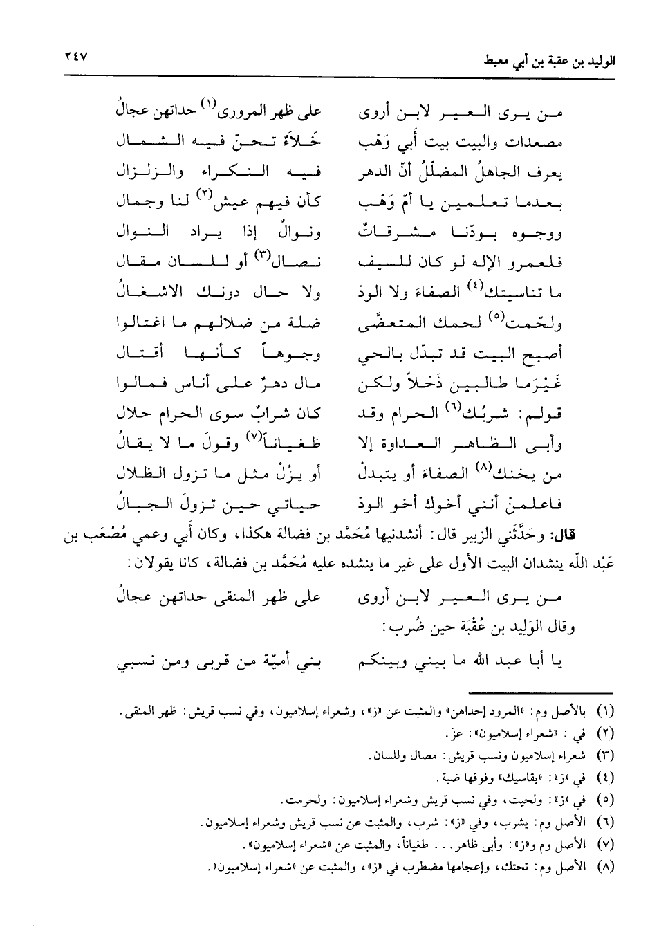 من يرى العير لابن أروى * على ظهر المرورى (1) حداتهن عجال مصعدات والبيت بيت أبي وهب * خلاء تحن فيه الشمال يعرف الجاهل المضلل أن الدهر * فيه النكراء والزلزال بعدما تعلمين يا أم وهب * كأن فيهم عيش (2) لنا وجمال ووجوه بودنا مشرقات * ونوال إذا يراد النوال فلعمرو والإله لو كان للسيف * بصال (3) أو للسان مقال ما تناسيتك (4) الصفاء ولا الود * ولا حال دونك الأشغال ولحمت (5) لحمك المتعضى * ضله من ضلالهم ما اغتالوا أصبح البيت قد تبدل بالحي * وجوها كأنها أقتال غير ما طالبين ذحلا ولكن * مال دهر على أناس فمالوا قولم شربك (6) الحرام وقد * كان شراب سوى الحرام حلال * وأبى الظاهر العداوة إلا * ظغيانا (7) وقول ما لا يقال من يخنك (8) الصفاء أو يتبدل * أو يزل مثل ما تزول الظلال فاعلمن أنني أخوك أخو الود * حياتي حين تزول الجبال * قال وحدثني الزبير قال أنشدنا محمد بن فضالة هكذا وكان أبي وعمي مصعب بن عبد الله ينشدان البيت الأول على غير ما ينشده عليه محمد بن فضالة كانا يقولان * من يرى العير لابن أروى * على ظهر المنقى حداتهن عجال وقال الوليد بن عقبة حين ضرب * يا أبا عبد الله ما بيني وبينكم * بني أمية من قربى ومن نسبي