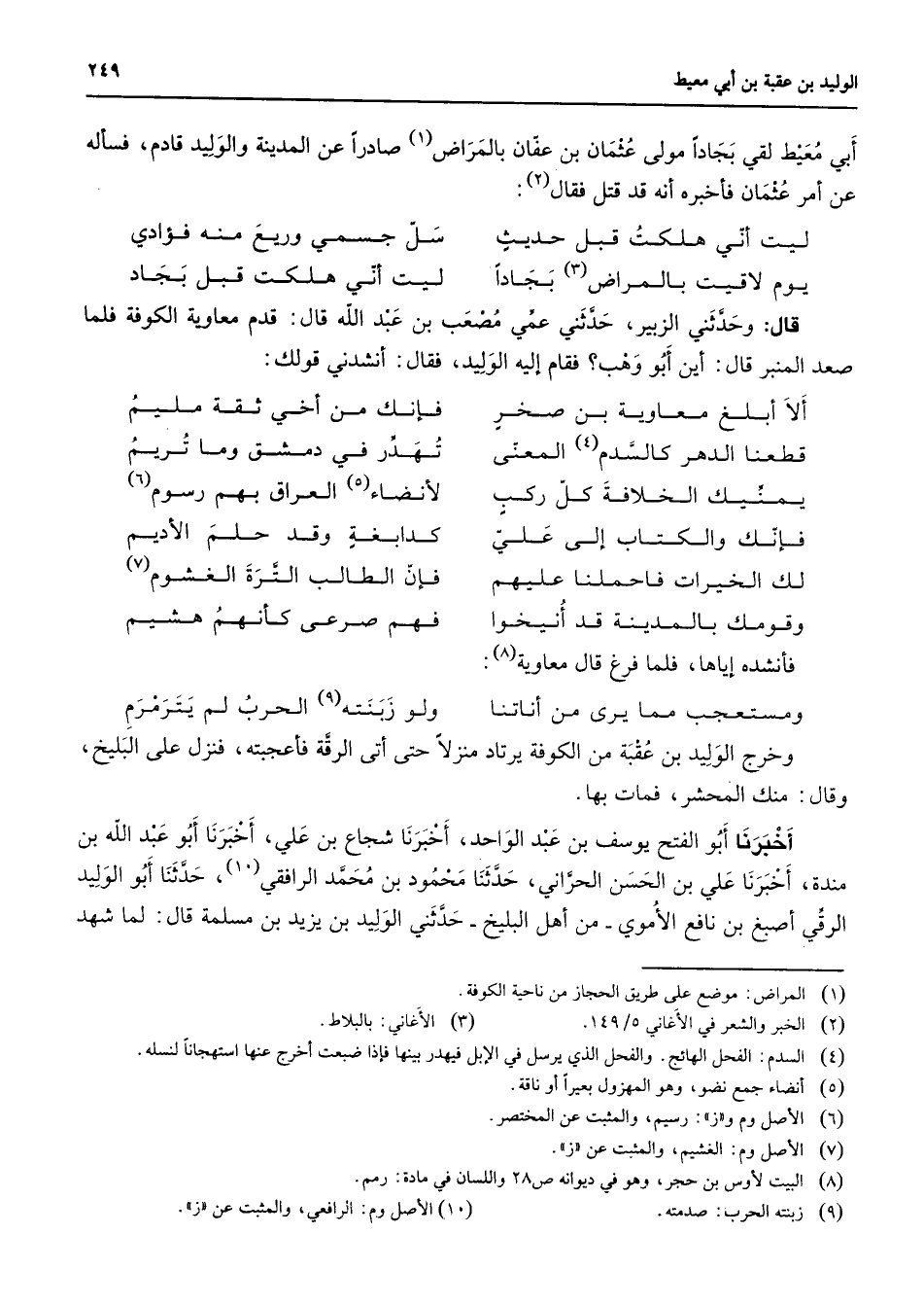 أبي معيط لقي بجادا مولى عثمان بن عفان بالمراض (1) صادرا عن المدينة والوليد قادم فسأله عن أمر عثمان فأخبره أنه قد قتل فقال (2) * ليت أني هلكت قبل حديث * سل جسمي وريع منه فؤادي يوم لاقيت بالمراض (3) بجادا * ليت أني هلكت قبل بجاد * قال وحدثني الزبير حدثني عمي مصعب بن عبد الله قال قدم معاوية الكوفة فلما صعد المنبر قال أبن أبو وهب فقام إليه الوليد فقال أنشدني قولك * ألا أبلغ معاوية بن صخر * فإنك من أخي ثقة مليم قطعنا الدهر كالسدم (4) المعنى * تهدر في دمشق وما تريم يمينك الخلافة كل ركب * لأنضاء (5) العراق بهم رسوم (6) فإنك والكتاب إلى علي * كدابغة وقد حلم الأديم لك الخيرات فاحملنا عليهم * فإن الطالب الترة الغشوم (7) وقومك بالمدينة قد انيخوا * فهم صرعى كأنهم هشيم فأنشده إياها فلما فرغ قال معاوية (8) ومستعجب مما يرى من أناتنا * ولو زبنته (9) الحرب لم يترمرم * وخرج الوليد بن عقبة من الكوفة يرتاد منزلا حتى أتى الرقة فأعجبته فنزل على البليخ وقال منك المحشر فمات بها أخبرنا أبو الفتح يوسف بن عبد الواحد أخبرنا شجاع بن علي أخبرنا أبو عبد الله بن مندة أخبرنا علي بن الحسن الحراني حدثنا محمود بن محمد الرافقي (10) حدثنا أبو الوليد الرقي أصبغ بن نافع الأموي من أهل البليخ حدثني الوليد بن يزيد بن مسلمة قال لما شهد