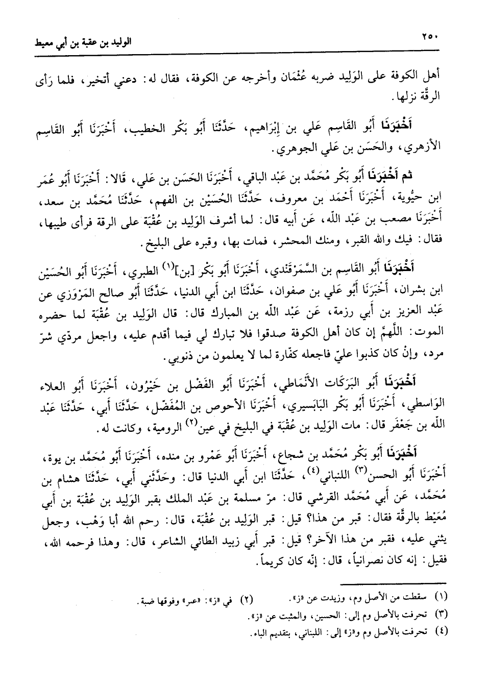 أهل الكوفة على الوليد ضربه عثمان وأخرجه عن الكوفة فقال له دعني أتخير فلما رأى الرقة نزلها أخبرنا أبو القاسم علي بن إبراهيم حدثنا أبو بكر الخطيب أخبرنا أبو القاسم الأزهري والحسن بن علي الجوهري ثم أخبرنا أبو بكر محمد بن عبد الباقي أخبرنا الحسن بن علي قالا أخبرنا أبو عمر ابن حيوية أخبرنا أحمد بن معروف حدثنا الحسين بن الفهم حدثنا محمد بن سعد أخبرنا مصعب بن عبد الله عن أبيه قال لما أشرف الوليد بن عقبة على الرقة فرأى طيبها فقال فيك والله القبر ومنك المحشر فمات بها وقبره على البليخ أخبرنا أبو القاسم بن السمرقندي أخبرنا أبو بكر بن (1) الطبري أخبرنا أبو الحسين ابن بشران أخبرنا أبو علي بن صفوان حدثنا ابن أبي الدنيا حدثنا أبو صالح المروزي عن عبد العزيز بن أبي رزمة عن عبد الله بن المبارك قال قال الوليد بن عقبة لما حضر هالموت اللهم إن كان أهل الكوفة صدقوا فلا تبارك لي فيما أقدم عليه واجعل مردي شر مرد وإن كان كذبوا علي فاجعله كفارة لما لا يعلمون من ذنوبي أخبرنا أبو البركات الأنماطي أخبرنا أبو الفضل بن خيرون أخبرنا أبو العلاء الواسطي أخبرنا أبو بكر البابسيري أخبرنا الأحوص بن المفضل حدثنا أبي حدثنا عبد الله بن جعفر قال مات الوليد بن عقبة في البليخ في عين (2) الرومية وكانت له أخبرنا أبو بكر محمد بن شجاع أخبر نا أبو غمرو بن منده أخبرنا أبو محمد بن يوة أخبرنا أبو الحسن (3) اللنباني (4) حدثنا ابن أبي الدنيا قال وحدثني أبي حدثنا هشام بن محمد عن أبي محمد القرشي قال مر مسلمة بن عبد الملك بقبر الوليد بن عقبة بن أبي معيط بالرقة فقال قبر من هذا قيل قبر الوليد بن عقبة قال رحم الله أبا وهب وجعل يثني عليه فقبر من هذا الآخر قيل قبر أبي زبيد الطائي الشاعر قال وهذا فرحمه الله فقيل إنه كان نصرانيا قال إنه كان كريما