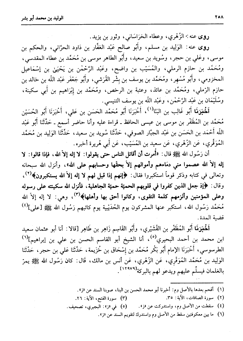 روى عنه الزهري وعطاء الخراساني وثور بن يزيد روى عنه الوليد بن مسلم وأبو صالح عبد الغفار بن داود الحراني والحكم بن موسى وعلي بن حجر وسويد بن سعيد وأبو الطاهر موسى بن محمد بن عطاء المقدسي ومحمد بن حازم الرملي والمسيب بن واضح وعبد الرحمن بن يحيى بن إسماعيل المخزومي وأبو مسهر ومحمد بن يوسف بن بشر القرشي وأبو جعفر عبد الله بن خالد بن حازم الرملي ومحمد بن عائذ وعتبة بن الرخص ومحمد بن إبراهيم بن أبي سكينة وسليمان بن عبد الرحمن وعبد الله بن يوسف التنيسي أخبرنا أبو غالب بن البنا (1) أخبرنا أبو محمد الحسن بن علي أخبرنا أبو الحسين محمد بن المظفر بن موسى بن عيسى الحافظ قراءة عليه وأنا حاضر أسمع حدثنا أبو عبد الله أحمد بن الحسن بن عبد الجبار الصوفي حدثنا سويد بن سعيد حدثنا الوليد بن محمد الموقري عن الزهري عن سعيد بن المسيب عن أبي هريرة أخبره أن رسول الله (صلى الله عليه وسلم) قال أمرت أن أقاتل الناس حتى يقولوا ل إله ألا الله فإذا قالوا لا إله إلا الله عصموا مني دماءهم وأموالهم إلا بحقها وحسابهم على الله وأنزل الله سبحانه وتعالى في كتابه وذكر قوما استكبروا فقال " إنهم إذا قيل لهم لا إله إلا الله يستكبرون (2) " وقال " إذ جعل الذين كفروا في قلوبهم الحمية حمية الجاهلية فأنزل الله سكينته على رسوله وعلى المؤمنين وألزمهم كلمة التقوى وكانوا أحق بها وأهلها " (3) وهي لا إله إلا الله محمد رسول الله استكبر عنها المشركون يوم الحديبية يوم كاتبهم رسول الله (صلى الله عليه وسلم) على (4) قضية المده أخبرنا أبو المظفر بن القشيري وأبو القاسم زاهر بن طاهر قالا أنا أبو عثمان سعيد ابن محمد بن أحمد البحيري (5) أنا الشيخ أبو القاسم الحسن بن علي بن إبراهيم (6) الطرسوسي أخبرنا الإمام أبو بكر محمد بن إسحاق بن خزيمة حدثنا علي بن حجر حدثنا الوليد بن محمد الموقري عن الزهري عن أنس بن مالك قال كان رسول الله (صلى الله عليه وسلم) يمر بالغلمان فيسلم عليهم ويدعو لهم بالبركة