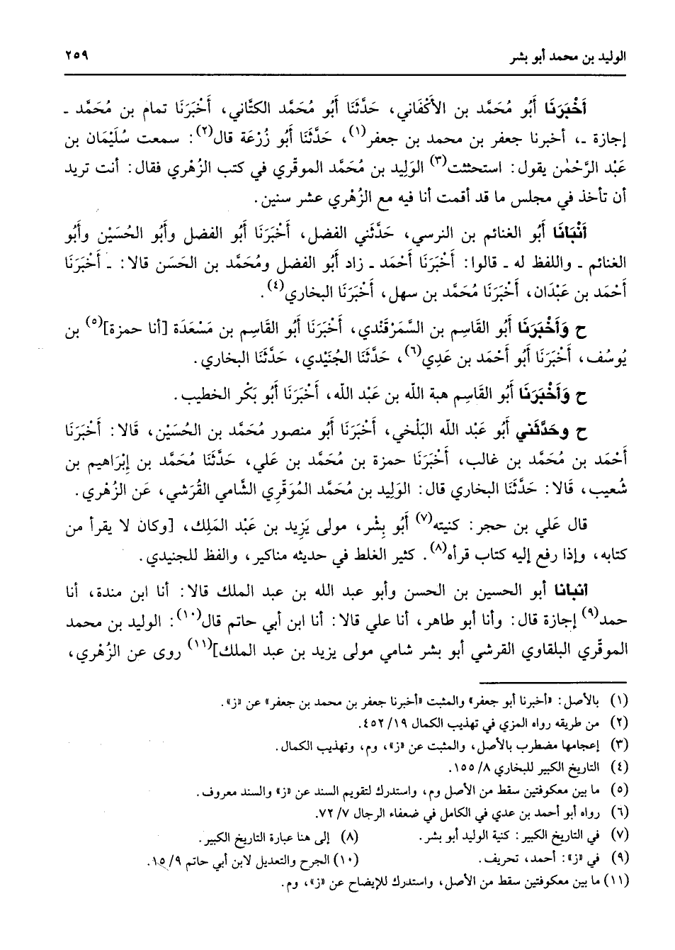 أخبرنا أبو محمد بن الأكفاني حدثنا أبو محمد الكتاني أخبرنا تمام بن محمد إجازة اخبرنا جعفر بن محمد بن جعفر (1) حدثنا أبو زرعة قال (2) سمعت سليمان بن عبد الرحمن يقول استحثثت (3) الوليد بن محمد الموقري في كتب الزهري فقال أنت تريد أن تأخذ في مجلس ما قد أقمت أنا فيه مع الزهري عشر سنين أبنأنا أبو الغنائم بن النرسي حدثني الفضل أخبرنا أبو الفضل وأبو الحسين وأبو الغنائم واللفظ له قالوا أخبرنا أحمد زاد أبو الفضل ومحمد بن الحسن قالا أخبرنا أحمد بن عبدان اخبرنا محمد بن سهل أخبرنا البخاري (4) وأخبرنا أبو القاسم بن السمرقندي أخبرنا أبو القاسم بن مسعدة أنا حمزة (5) بن يوسف أخبرنا أبو أحمد بن عدي (6) حدثنا الجنيدي حدثنا البخاري وأخبرنا أبو القاسم هبة الله بن عبد الله أخبرنا أبو بكر الخطيب وحدثني أبو عبد الله البلخي أبو منصور محمد بن الحسين قالا أخبرنا أحمد بن محمد بن غالب أخبرنا حمزة بن محمد بن علي حدثنا محمد بن إبراهيم بن شعيب قالا حدثنا البخاري قال الوليد بن محمد الموقري الشامي القرشي عن الزهري قال علي بن حجر كنيته (7) أبو بشر مولى يزيد بن عبد الملك وكان لا يقرأ من كتابه وإذا رفع إليه كتاب قرأه (8) كثير الغلط في حديثه مناكير والفظ للجنيدي أبنأنا أبو الحسين بن الحسن وأبو عبد الله بن عبد الملك قالا أنا ابن منده أنا حمد (9) إجازة قال وأنا أبو طاهر أنا علي قالا أنا ابن أبي حاتم قال (10) الوليد بن محمد الموقري البلقاوي القرشي أبو بشر شامي مولى يزيد بن عبد الملك (11) روى عن الزهري