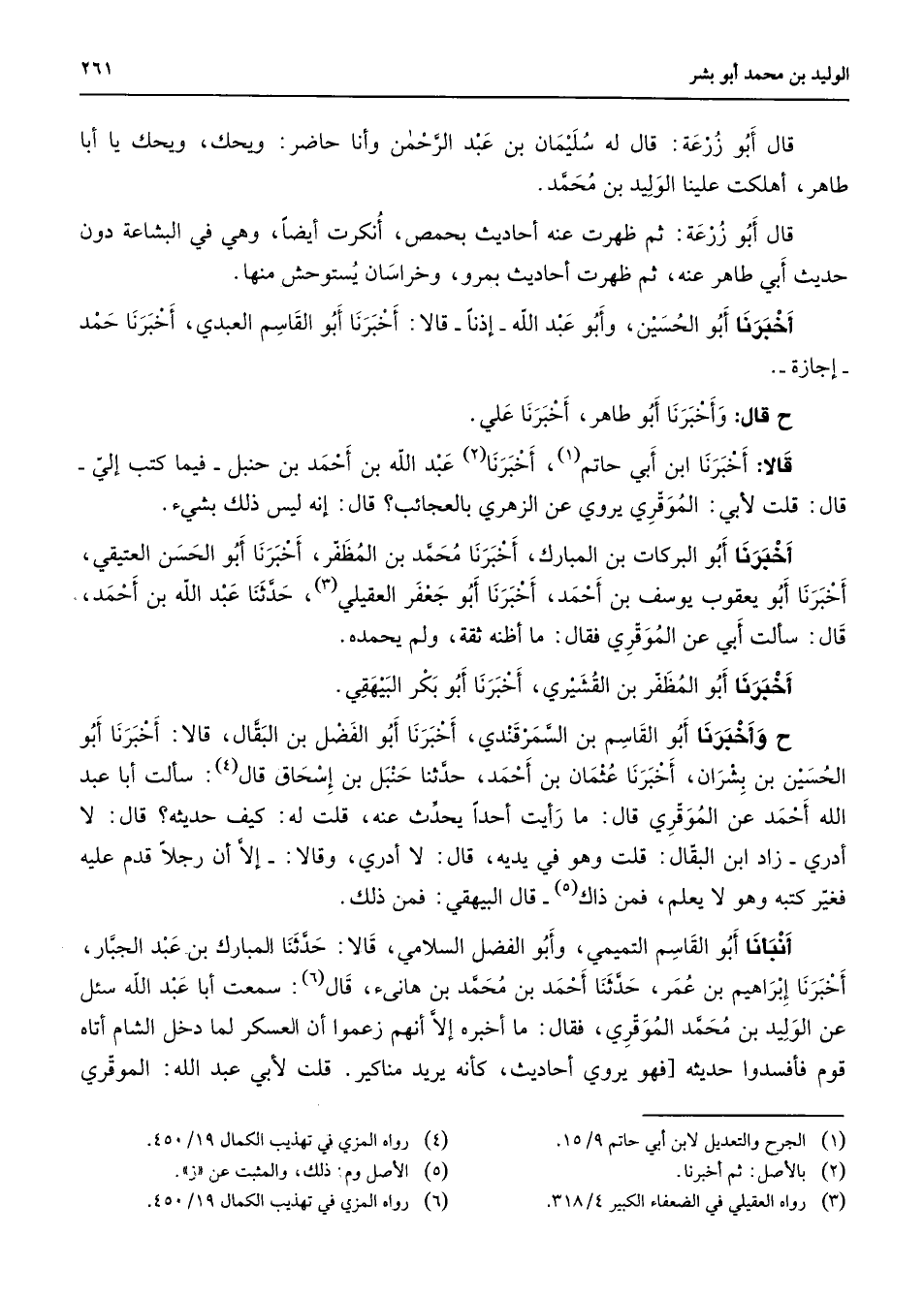 قال أبو زرعة قال له سليمان بن عبد الرحمن وأنا حاضر ويحك ويحك يا أبا طاهر أهلكت علينا الوليد بن محمد قال أبو زرعة ثم ظهرت عنه أحاديث بحمص أنكرت أيضا وهي في البشاعة دون حديث أبي طاهر عنه ثم ظهرت أحاديث بمرو وخراسان يستوحشن منها أخبرنا أبو الحسين وأبو عبد الله إذنا قالا أخبرنا أبو القاسم العبدي أخبرنا محمد إجازة قال وأخبرنا أبو طاهر أخبرنا علي قالا أخبرنا ابن أبي حاتم (1) أخبرنا (2) عبد الله بن أحمد بن حنبل فيما كتب إلي قال فلت لأبي الموقري يروي عن الزهري بالعجائب قال إنه ليس ذلك بشئ ح وأخبرنا أبو البركات بن المبارك أخبرنا محمد بن المظفر أخبرنا أبو الحسن العتيقي أخبرنا أبو يعقوب يوسف بن أحمد أخبرنا أبو جعفر العقيلي (3) حدثنا عبد الله بن أحمد قال سألت أبي عن الموقري فقال ما أظنه ثقة ولم يحمده أخبرنا أبو المظفر بن القشيري أخبرنا أبو بكر البيهقي أخبرنا أبو القاسم بن السمرقندي أخبرنا أبو الفضل بن البقال قالا أخبرنا أبو الحسين بن بشران أخبرنا عثمان بن أحمد حدثنا حنبل بن إسحاق قال (4) سألت أبا عبد الله أحمد عن الموقري قال ما رأيت أحدا يحدث عنه قلت له كيف حديثه قال لا أدري زاد ابن البقال قلت وهو في يديه قال لا أدري وقالا إلا أن رجلا قدم عليه فغير كتبه وهو لا يعلم فمن ذاك (5) قال البيهقي فمن ذلك أنبأنا أبو القاسم التميمي وأبو الفضل السلامي قالا حدثنا المبارك بن عبد الجبار أخبرنا إبراهيم بن عمر حدثنا أحمد بن محمد بن هانئ قال (6) سمعت أبا عبد الله سئل عن الوليد بن محمد الموقري فقال ما أخبره إلا أنهم زعموا أن العسكر لما دخل الشام أتاه قوم فأفسدوا حديثه فهو يروي أحاديث كأنه يريد مناكير قلت لأبي عبد الله الموقري
