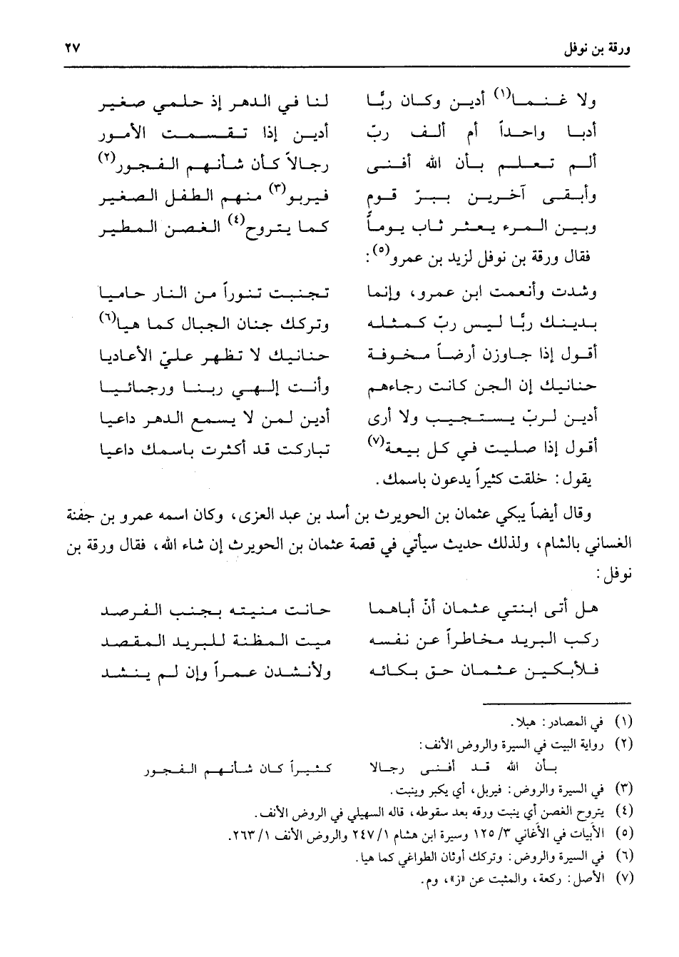 ولا غنما (1) أدين وكان ربا * لنا في الدهر إذ حلمي صغير أدبا واحدا أم ألف رب * أدين إذا تقسمت الأمور ألم تعلم بأن الله أفنى * رجالا كان شأنهم الفجور (2) وأبقى آخرين ببر قوم * فيربو (3) منهم الطفل الصغير وبين المرء يعثر ثاب يوما * كما يتروح (4) الغصن المطير فقال ورقة بن نوفل لزيد بن عمرو (5) وشدت وأنعمت ابن عمرو وإنما * تجنبت تنورا من النار حاميا بدينك ربا ليس رب كمثله * وتركك جنان الجبال كما هيا (6) أقول إذا جاوزن أرضا مخوفة * حنانيك لا تظهر علي الأعاديا حنانيك إن الجن كانت رجاءهم * وأنت إلهي ربنا رجائيا أدين لرب يستجيب ولا أرى * أدين لمن لا يسمع الدهر داعيا أقول إذا صليت في كل بيعة (7) * تباركت قدأكثرت باسمك داعيا يقول خلقت كثيرا يدعون باسمك وقال أيضا يبكي عثمان بن الحويرث بن أسد بن عبد العزي وكان إسمه عمرو بن جفنة الغساني بالشام ولذلك حديث سيأتي في قصة عثمان بن الحويرث إن شاء الله فقال ورقة بن نوفل هل أتى ابنتي عثمان أن أباهما * حانت منيته بجنب الفرصد ركب البريد مخاطرا عن نفسه * ميت المظنة للبريد المقصد فلأبكين عثمان حق بكائه * ولأنشدن عمرا وإن لم ينشد