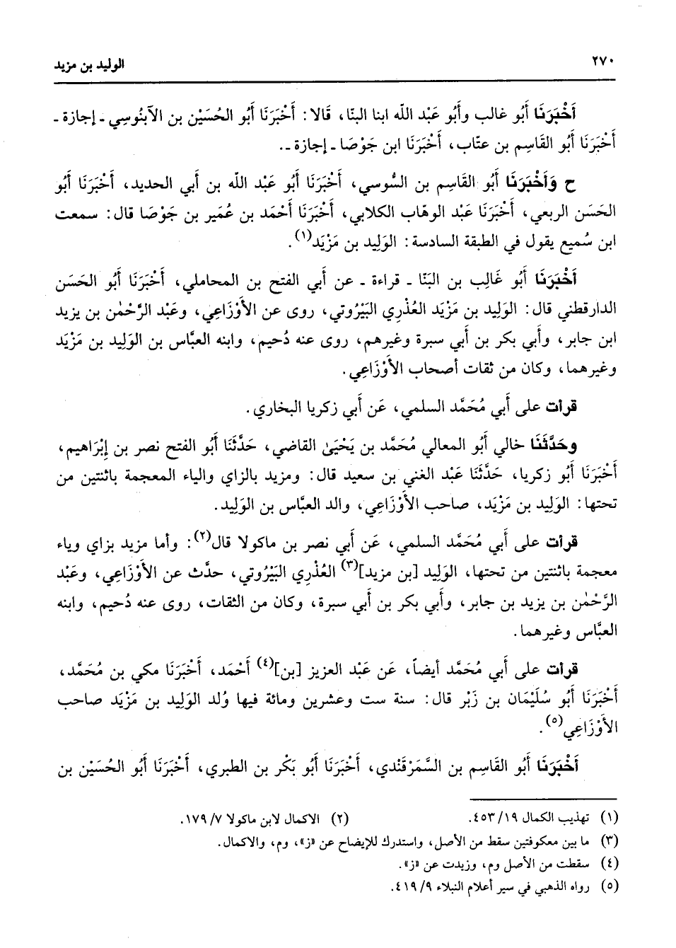 أخبرنا أبو غالب وأبو عبد الله ابنا البنا قالا أخبرنا أبو الحسين بن الآبنوسي إجازة أخبرنا أبو القاسم بن عتاب أخبرنا ابن جوصا إجازة وأخبرنا أبو القاسم بن السوسي أخبرنا أبو عبد الله بن أبي الحديد أخبرنا أبو الحسن الربعي أخبرنا عبد الوهاب الكلابي أخبرنا أحمد بن عمير بن جوصا قال سمعت ابن سميع يقول في الطبقة السادسة الوليد بن مزيد (1) أخبرنا أبو غالب بن البنا قراءة عن أبي الفتح بن المحاملي أخبرنا أبو الحسن الدارقطني قال الوليد بن مزيد العذري البيروتي روى عن الأوزاعي وعبد الرحمن بن يزيد ابن جابر وأبي بكر بن أبي سبرة وغيرهم روى عنه دحيم وابنه العباس بن الوليد بن مزيد وغيرهما وكان من ثقات أصحاب الأوزاعي قرأت على أبي محمد السلمي عن أبي زكريا البخاري وحدثنا خالي أبو المعالي محمد بن يحيى القاضي حدثنا أبو الفتح نصر بن إبراهيم أخبرنا أبو زكريا حدثنا عبد الغني بن سعيد قال ومزيد بالزاي والياء المعجمة باثنتين من تحتها الوليد بن مزيد صاحب الأوزاعي والد العباس بن الوليد قرأت على أبي محمد السلمي عن أبي نصر بن ماكولا قال (2) وأما مزيد بزاي وياء معجمة باثنتين من تحتها الوليد بن مزيد (3) العذري البيروتي حدث عن الأوزاعي وعبد الرحمن بن يزيد بن جابر وأبي بكر بن أبي سبرة وكان من الثقات روى عنه دحيم وابنه العباس وغيرهما قرأت على أبي محمد أيضا عن عبد العزيز بن (4) أحمد أخبرنا مكي بن محمد أخبرنا أبو سليمان بن زبر قال سنة ست وعشرين ومائة فيها ولد الوليد بن مزيد صاحب الأوزاعي (5) أخبرنا أبو القاسم بن السمرقندي أخبرنا أبو بكر بن الطبري أخبرنا أبو الحسين بن